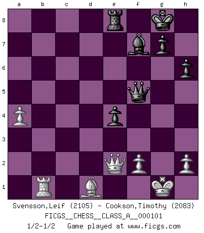 Last move : 1/2-1/2 2012 March 30 9:44:35 [Event "FICGS__CHESS__CLASS_A__000101"] [Site "FICGS"] [Date "2011.08.03"] [Round "1"] [White "Svensson,Leif"] [Black "Cookson,Timothy"] [Result "1/2-1/2"] [WhiteElo "2105"] [BlackElo "2083"] 1.e4 c5 2.c3 Nf6 3.e5 Nd5 4.Nf3 Nc6 5.Bc4 Nb6 6.Bb3 c4 7.Bc2 d5 8.exd6 e5 9.O-O Be6 10.Re1 Bxd6 11.d3 cxd3 12.Qxd3 h6 13.a4 Bc7 14.Qe2 a6 15.Be3 Nd7 16.Nbd2 O-O 17.Rad1 f5 18.b4 Qf6 19.Nc4 Rae8 20.Nd6 Bxd6 21.Rxd6 e4 22.Nd4 Nxd4 23.cxd4 Qe7 24.Bf4 Rf6 25.b5 Bf7 26.Rxf6 Nxf6 27.bxa6 bxa6 28.Qxa6 Qb4 29.Rb1 Qc3 30.Qe2 Nd5 31.Be5 Nb4 32.Bd1 Nd3 33.g4 Nxe5 34.dxe5 Qxe5 35.gxf5 Qxf5 1/2-1/2 Sicilian : Alapin's variation (2.c3) Kingside Castling by player White (move 9) Kingside Castling by player Black (move 16) This chess game ended in a draw. Follow this game move after move (download)Man is a frivolous, a specious creature, and like a Chess player, cares more for the process of attaining his goal than for the goal itself. (Dostoyevsky) Der Umstand, daß uns eine 7 Stunden Zeitkontrolle ermöglicht eine großartige, tiefe Partie zu spielen, ist für die Massenmedien nicht weiter von Bedeutung. (Alexej Shirov) Tu eres para mi la Reina en d8 y yo soy el Peón en d7!!. (GM Eduard Gufeld) Vous n'êtes pas toujours obligé de jouer le meilleur coup. Un coup doit être actif, entreprenant, correct et beau ! (David Bronstein) Experiences are the keys to life. (Daniel Parmet)