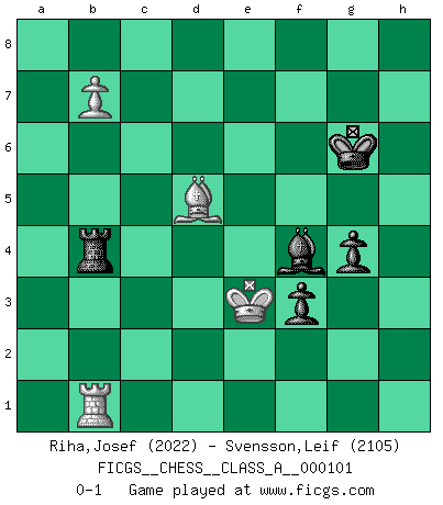 Last move : 0-1 2012 February 3 21:19:19 [Event "FICGS__CHESS__CLASS_A__000101"] [Site "FICGS"] [Date "2011.08.03"] [Round "1"] [White "Riha,Josef"] [Black "Svensson,Leif"] [Result "0-1"] [WhiteElo "2022"] [BlackElo "2105"] 1.d4 Nf6 2.Nf3 c5 3.g3 cxd4 4.Nxd4 e5 5.Nb3 d5 6.Bg2 Be6 7.O-O Be7 8.Nc3 O-O 9.Bg5 Nbd7 10.f4 d4 11.fxe5 dxc3 12.exf6 Nxf6 13.bxc3 Qc7 14.Bf4 Qxc3 15.Qd3 Nd5 16.Qxc3 Nxc3 17.Be5 Nxe2+ 18.Kf2 Rae8 19.Kxe2 Bxb3 20.axb3 Bc5 21.Bxb7 Rxe5+ 22.Kf3 Re3+ 23.Kg4 Re2 24.c3 Rxh2 25.b4 h5+ 26.Kf3 Bb6 27.c4 g5 28.c5 Bc7 29.Bc6 g4+ 30.Ke3 Bb8 31.Rh1 Rxh1 32.Rxh1 f5 33.Rxh5 Kg7 34.Kf2 Kg6 35.Rh1 Rd8 36.b5 Rd3 37.b6 axb6 38.cxb6 Bxg3+ 39.Ke2 Rb3 40.b7 Be5 41.Bd5 Rb2+ 42.Kd3 Rb4 43.Ke2 f4 44.Rb1 f3+ 45.Ke3 Bf4+ 0-1 Queen's pawn game Kingside Castling by player White (move 7) Kingside Castling by player Black (move 8) 10 pieces endgame at move 38 : White KRBPP , Black KRBPP WHITE : King + 1 Rook 1 Bishop 2 Pawns BLACK : King + 1 Rook 1 Bishop 2 Pawns 9 pieces endgame at move 38 : White KRBP , Black KRBPP WHITE : King + 1 Rook 1 Bishop 1 Pawn BLACK : King + 1 Rook 1 Bishop 2 Pawns Player Black won this chess game. Follow this game move after move (download)I won't play with you anymore. You have insulted my friend. - When an opponent cursed himself for a blunder. (Miguel Najdorf) Ich bin es gewohnt, das die Jugend mir überhaupt keinen Respekt entgegenbringt. (Alexander Morozewich) Si tu oponente te ofrece un empate, trata de averiguar porque piensa él que esta en una posición peor. (Nigel Short) Echiquier : carré parfait, comme la Jérusalem nouvelle décrite par l'auteur de l'Apocalypse, huit cases sur huit, exaltation du chiffre 4, symbole du cosmos aux quatre horizons... où le noir et le blanc, l'ombre et la lumière, le mal et le bien s'entremêlent et se conjuguent. (Robert Couffignal, Le Gambit du poète) History is the quarrels of popes and kings, with wars or pestilences in every page; the men all so good for nothing, and hardly any women at all. (Jane Austen)