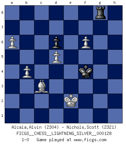 Last move : 1-0 2011 August 7 18:4:31 [Event "FICGS__CHESS__LIGHTNING_SILVER__000128"] [Site "FICGS"] [Date "2011.08.07"] [Round "1"] [White "Alcala,Alvin"] [Black "Nichols,Scott"] [Result "1-0"] [WhiteElo "2304"] [BlackElo "2321"] 1.e4 c5 2.Nf3 d6 3.d4 cxd4 4.Nxd4 Nf6 5.Nc3 a6 6.Be3 e5 7.Nb3 Be6 8.Be2 Be7 9.Nd5 Nxd5 10.exd5 Bf5 11.Qd2 Nd7 12.O-O O-O 13.Na5 Qc8 14.Rac1 Qc7 15.f3 Bg6 16.b4 Rad8 17.c4 Rfe8 18.Bd1 e4 19.f4 f5 20.Nb3 Nf6 21.Nd4 Qd7 22.Ne6 Ra8 23.g4 Reb8 24.Bd4 Bd8 25.g5 Ne8 26.h4 Bf7 27.h5 Rc8 28.Nxd8 Qxd8 29.Be2 Qd7 30.Bb6 Nc7 31.Qd4 Qa4 32.Qb2 Qd7 33.Kg2 a5 34.Bxa5 Qe7 35.h6 gxh6 36.Rh1 h5 37.Kg3 Ne8 38.Bxh5 Bxh5 39.Rxh5 b5 40.Rch1 Rxc4 41.Rxh7 Qxh7 42.Rxh7 Kxh7 43.Qh2+ Kg8 44.Qh6 Rc3+ 45.Kh4 Rf3 46.Qe6+ Kh8 47.Qxf5 Ng7 48.Qxe4 Rf1 49.Kg4 Rg1+ 50.Kf3 Re8 51.Qd3 Rh1 52.Kg2 Rh4 53.Bb6 Rf8 54.Be3 Nf5 55.Bd2 Rg4+ 56.Kf1 Kh7 57.Qxb5 Rxg5 58.a4 Rg7 59.Kf2 Rg3 60.a5 Rh3 61.Qd7+ Kg6 62.Qe6+ Kh5 63.Qe2+ Kh6 64.Qe1 Rh2+ 65.Kg1 Nd4 66.f5 Kh5 67.Qd1+ Re2 68.Bc3 Nf3+ 69.Kf1 Re3 70.Bd4 Re1+ 71.Qxe1 Nxe1 72.Kxe1 Kg5 73.Ke2 Rb8 74.Bc3 Rg8 75.f6 Kf4 76.a6 1-0 Sicilian : Najdorf, Byrne (English) attack Kingside Castling by player White (move 12) Kingside Castling by player Black (move 12) 10 pieces endgame at move 71 : White KBPPPP , Black KRNP WHITE : King + 1 Bishop 4 Pawns BLACK : King + 1 Rook 1 Knight 1 Pawn 9 pieces endgame at move 72 : White KBPPPP , Black KRP WHITE : King + 1 Bishop 4 Pawns BLACK : King + 1 Rook 1 Pawn Player White won this chess game. Follow this game move after move (download)Pawns: they are the soul of this game, they alone form the attack and defense. (Philidor) Stil? Ich habe keinen Stil! (Anatoly Karpov) Buenas posiciones no logran ganar juegos, buenas movidas sí. (Gerald Abrahams) Le profane ne songe pas à la somme de jouissance dont il se prive, qui méconnaît ce jeu aux ressources aussi variées que passionnantes. (Jean-Marie Jeanton-Lamarche) A belief is an idea the mind possesses, an idea that possesses the mind. (Robert Oxden Bolton)