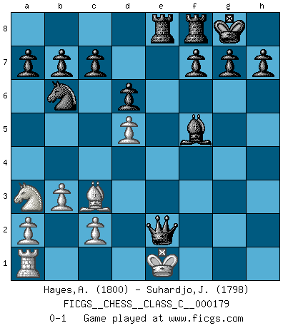 Last move : 0-1 2011 November 7 6:42:29 [Event "FICGS__CHESS__CLASS_C__000179"] [Site "FICGS"] [Date "2011.08.08"] [Round "1"] [White "Hayes,Alexander"] [Black "Suhardjo,Johanes"] [Result "0-1"] [WhiteElo "1800"] [BlackElo "1798"] 1.e3 Nf6 2.b3 e5 3.Bb2 d6 4.h3 Nc6 5.d4 exd4 6.exd4 Be7 7.d5 Ne5 8.Nf3 Nxf3+ 9.Qxf3 O-O 10.g4 Nd7 11.Rg1 Bh4 12.Qc3 Bf6 13.g5 Bxc3+ 14.Bxc3 Nb6 15.h4 Qe7+ 16.Kd1 Qe4 17.h5 Bf5 18.Bd3 Qf3+ 19.Kd2 Qxf2+ 20.Be2 Qxg1 21.h6 Qxg5+ 22.Ke1 Qxh6 23.Na3 Rae8 24.Kf2 Qh2+ 25.Ke1 Qxe2+ 0-1 Van't Kruijs Opening Kingside Castling by player Black (move 9) Player Black won this chess game. Follow this game move after move (download)We like to think. (Gary Kasparov) Später, ... hatte ich zunehmend Erfolg in entscheidenden Partien. Vielleicht weil ich eine einfache Wahrheit erkannte: nicht nur ich hatte Angst, auch mein Gegner. (Mikhail Nekhemyevich Tal) Sin errores no puede haber brillantez. (Emanuel Lasker) Mais l'homme est une créature légère et illogique : semblable au joueur d'échecs, il n'aime que le processus du but à atteindre, non le but lui-même. (Dostoïevsky) Big Chess is a place for big hallucinations. (Thibault de Vassal)