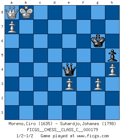 Last move : 1/2-1/2 2013 April 2 4:34:27 [Event "FICGS__CHESS__CLASS_C__000179"] [Site "FICGS"] [Date "2011.08.08"] [Round "1"] [White "Moreno,Ciro"] [Black "Suhardjo,Johanes"] [Result "1/2-1/2"] [WhiteElo "1635"] [BlackElo "1798"] 1.d4 Nf6 2.c4 e6 3.Nf3 b6 4.g3 Ba6 5.b3 b5 6.cxb5 Bxb5 7.Bg2 d5 8.O-O Nbd7 9.Nc3 Ba6 10.Rb1 Bb4 11.Na4 O-O 12.a3 Bd6 13.b4 Rb8 14.Qc2 Bb5 15.Nc5 Qe7 16.Bb2 a5 17.Nxd7 Nxd7 18.bxa5 Bc4 19.Rfe1 Bxa3 20.Nd2 Rxb2 21.Rxb2 Bxb2 22.Qxb2 Ba6 23.e4 Rb8 24.Qc2 dxe4 25.Bxe4 Nf8 26.Bd3 Bxd3 27.Qxd3 Ra8 28.Ra1 Qd7 29.a6 Qc6 30.a7 Nd7 31.Ne4 Nb6 32.Nc5 g6 33.Ra5 Nc8 34.Qa3 Qd5 35.Qa1 h5 36.h4 Kh7 37.Qa3 Kg7 38.Qa4 Nb6 39.Qa1 Nc4 40.Ra2 Nd6 41.Ra4 Nb5 42.Nd3 Kh7 43.Ne5 f6 44.Nd3 e5 45.dxe5 Qxd3 46.exf6 Qd5 47.Qe1 Nd6 48.Ra5 Qe4 49.Qd1 Qe8 50.Ra3 Qc6 51.Re3 Nf5 52.Rd3 Qxf6 53.Rd7+ Ng7 54.Rxc7 Qb6 55.Qd7 Qf6 56.Qa4 Qe5 57.Rb7 Rf8 58.Qb4 Re8 59.Re7 Qa1+ 60.Kg2 Rf8 61.Rb7 Qa6 62.Qb2 Rg8 63.Rc7 Kh6 64.Qb7 Qa1 65.Rc6 Rf8 66.Qe7 Ra8 67.Rxg6+ Kxg6 68.Qe4+ Nf5 69.Qxa8 Ne3+ 70.fxe3 Qa2+ 71.Kf1 Qb1+ 72.Ke2 Qa2+ 73.Kd3 Qb1+ 74.Kd4 Qa1+ 75.Kd5 Qa5+ 76.Kc4 Qa2+ 77.Kc5 Qa5+ 78.Kd6 Qb4+ 79.Ke6 Qg4+ 80.Ke5 Qf5+ 81.Kd6 Qf6+ 82.Kc7 Qe7+ 83.Kb6 Qb4+ 84.Ka6 Qa4+ 85.Kb7 Qe4+ 86.Kb8 Qe8+ 87.Kb7 Qe4+ 88.Kb8 1/2-1/2 Queen's Indian : Nimzovich variation (exaggerated Fianchetto) Kingside Castling by player White (move 8) Kingside Castling by player Black (move 11) 10 pieces endgame at move 69 : White KQPPPP , Black KQNP WHITE : King + 1 Queen 4 Pawns BLACK : King + 1 Queen 1 Knight 1 Pawn 9 pieces endgame at move 70 : White KQPPPP , Black KQP WHITE : King + 1 Queen 4 Pawns BLACK : King + 1 Queen 1 Pawn This chess game ended in a draw. Follow this game move after move (download)Help your pieces so they can help you. (Paul Morphy) Viele Opfer benötigen überhaupt keine konkrete Berechnung. Es genügt sich die entstehende Position kurz vorzustellen, um uns davon zu überzeugen, dass das Opfer korrekt ist. (Mikhail Nekhemyevich Tal) El Ajedrez expande y enriquece tu mente. (Saudin Robovic) Demandez au pauvre Cg1 ce qu'il en pense. Eduard Gufeld à propos de la variante Saemisch de l'Est-Indienne. It is not enough to be a good player... you must also play well. (Siegbert Tarrasch)
