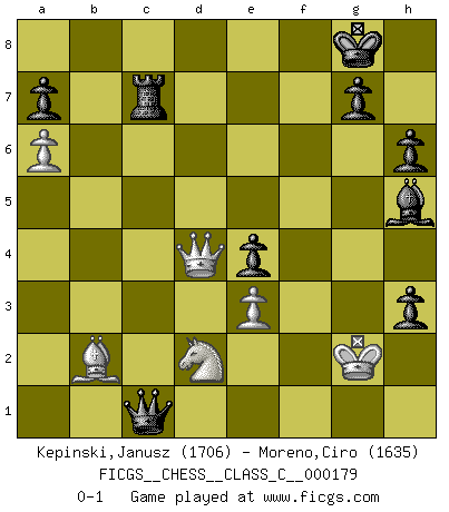 Last move : 0-1 2011 November 25 0:10:57 [Event "FICGS__CHESS__CLASS_C__000179"] [Site "FICGS"] [Date "2011.08.08"] [Round "1"] [White "Kepinski,Janusz"] [Black "Moreno,Ciro"] [Result "0-1"] [WhiteElo "1706"] [BlackElo "1635"] 1.d4 d5 2.c4 e6 3.Nf3 Nf6 4.e3 c6 5.cxd5 exd5 6.Bd3 Bd6 7.h3 O-O 8.O-O Ne4 9.Bxe4 dxe4 10.Nfd2 f5 11.Nc3 Be6 12.a4 Bc7 13.b4 Qd6 14.g3 Bf7 15.Kg2 Nd7 16.Ba3 Rfd8 17.Qc2 Qe6 18.Rfe1 Rac8 19.a5 Qg6 20.a6 bxa6 21.Bb2 a5 22.bxa5 c5 23.Nb5 Bxg3 24.fxg3 cxd4 25.Nc7 Qd6 26.Rac1 Ne5 27.Bxd4 Nd3 28.Rf1 Nxc1 29.Rxc1 Rd7 30.Qb1 Rdxc7 31.Rxc7 Qxc7 32.Qb4 h6 33.Ba1 Bh5 34.a6 Qc1 35.Qd4 Rc7 36.g4 fxg4 37.Bb2 gxh3+ 0-1 Queen's gambit declined Kingside Castling by player Black (move 7) Kingside Castling by player White (move 8) Player Black won this chess game. Follow this game move after move (download)Play the opening like a book, the middle game like a magician, and the endgame like a machine. (Spielmann) Moralische Siege zählen nicht. (Savielly Grigorievitsch Tartakower) Tu cuerpo tiene que estar en óptima condición. Tu Ajedrez se deteriora como lo hace tu cuerpo. No puedes separar la mente y el cuerpo. (Bobby Fischer) Il a essayé de se convaincre qu'il pourrait empêcher toutes les erreurs et ne jamais perdre. L'horreur ! Gary Kasparov au sujet de Robert Fischer. When you have everything, sometimes it feels like nothing. (Horatio Caine, C.S.I. Miami)