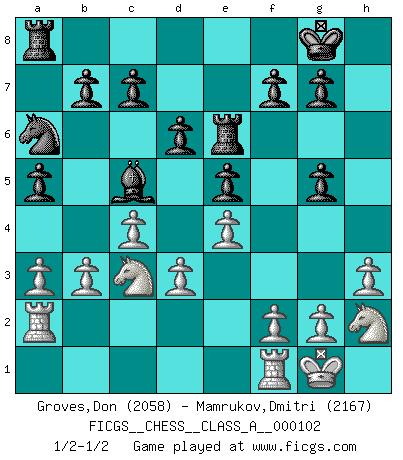 Last move : 1/2-1/2 2011 September 2 8:17:33 [Event "FICGS__CHESS__CLASS_A__000102"] [Site "FICGS"] [Date "2011.08.08"] [Round "1"] [White "Groves,Don"] [Black "Mamrukov,Dmitri"] [Result "1/2-1/2"] [WhiteElo "2058"] [BlackElo "2167"] 1.c4 e5 2.Nc3 Nf6 3.Nf3 Nc6 4.e4 Bb4 5.d3 d6 6.h3 O-O 7.Be2 Bc5 8.O-O Re8 9.a3 a5 10.Nb5 h6 11.Be3 Nh7 12.b3 Bd7 13.Nh2 Nb8 14.Nc3 Ng5 15.Bg4 Bxg4 16.Qxg4 Na6 17.Ra2 Re6 18.Bxg5 Qxg5 19.Qxg5 hxg5 1/2-1/2 English Opening Kingside Castling by player Black (move 6) Kingside Castling by player White (move 8) This chess game ended in a draw. Follow this game move after move (download)Tactics flow from a superior position. (Bobby Fischer) Kasparov stellt für gewöhnlich die Regeln auf und bricht sie dann selbst wieder. (Alexej Shirov) Prefiero perder una partida realmente buena, que ganar una mala. (David Levy) Dans le domaine de la peinture, de la gravure et de la sculpture, dès la première décennie de notre siècle, les artistes abandonnent la représentation de la partie d'échecs pour se concentrer sur les pièces, sur les échiquiers et sur toutes les variations auxquelles les unes et les autres peuvent donner lieu. On passe en quelque sorte d'un thème social à un thème musical (au sens de la musica médiévale, c'est-à-dire d'une notion qui inclue le rythme, l'harmonie, la construction et la déconstruction, etc.). Graphiquement et picturalement, l'échiquier apparaît comme une structure ouverte, dynamique, d'une richesse infinie, autorisant toutes les combinatoires et débouchant sur des mouvements et des rythmes de nature exponentielle. (Michel Pastoureau) There are 10 types of people in this world: those who understand binary and those who don't. (Anonymous)