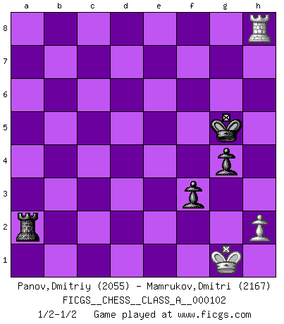 Last move : 1/2-1/2 2011 October 11 15:59:45 [Event "FICGS__CHESS__CLASS_A__000102"] [Site "FICGS"] [Date "2011.08.08"] [Round "1"] [White "Panov,Dmitriy"] [Black "Mamrukov,Dmitri"] [Result "1/2-1/2"] [WhiteElo "2055"] [BlackElo "2167"] 1.e4 c6 2.d4 d5 3.exd5 cxd5 4.c4 Nf6 5.Nc3 e6 6.Nf3 Be7 7.cxd5 Nxd5 8.Bd3 Nc6 9.O-O O-O 10.Re1 Bf6 11.Be4 Nce7 12.Ne5 Bd7 13.Qd3 h6 14.Ng4 Bc6 15.Bd2 Rc8 16.Rad1 Bg5 17.Bxg5 hxg5 18.Ne5 Nf4 19.Nxc6 Nxd3 20.Nxd8 Nxb2 21.Rb1 Rfxd8 22.Ne2 Nc4 23.Rxb7 Nd6 24.Rxe7 Nxe4 25.Rxa7 Rc2 26.f3 Nf6 27.Ng3 Rxd4 28.Re2 Rc1+ 29.Kf2 g4 30.Ne4 Nxe4+ 31.fxe4 R1c4 32.e5 g5 33.Ra3 Kg7 34.Kg3 Kg6 35.Rf2 Ra4 36.Re3 Rf4 37.Rfe2 Kh5 38.Rb3 Rfe4 39.Rxe4 Rxe4 40.Rb7 Kg6 41.Rb5 Ra4 42.Rb2 Ra5 43.Kxg4 Rxe5 44.Kf3 Ra5 45.Re2 Ra3+ 46.Kf2 g4 47.Ke1 Kf6 48.Kd1 e5 49.Kc1 Ke6 50.Kb2 Ra5 51.g3 f5 52.Kc3 Kd5 53.Rb2 Ke4 54.Kd2 f4 55.gxf4 exf4 56.Ke2 Kf5 57.Kf1 Kg5 58.Kg1 Kh4 59.Rb4 f3 60.Rb8 Rxa2 61.Rh8+ Kg5 1/2-1/2 Caro-Kann : Panov-Botvinnik attack, 5...e6 Kingside Castling by player White (move 9) Kingside Castling by player Black (move 9) 10 pieces endgame at move 43 : White KRPPP , Black KRPPP WHITE : King + 1 Rook 3 Pawns BLACK : King + 1 Rook 3 Pawns 9 pieces endgame at move 55 : White KRPPP , Black KRPP WHITE : King + 1 Rook 3 Pawns BLACK : King + 1 Rook 2 Pawns 8 pieces endgame at move 55 : White KRPP , Black KRPP WHITE : King + 1 Rook 2 Pawns BLACK : King + 1 Rook 2 Pawns 7 pieces endgame at move 60 : White KRP , Black KRPP WHITE : King + 1 Rook 1 Pawn BLACK : King + 1 Rook 2 Pawns This chess game ended in a draw. Follow this game move after move (download)It is difficult to play against Einstein's theory --on his first loss to Fischer. (Mikhail Tal) Ich bin Weltmeister und muß mit niemandem irgend etwas diskutieren. (Viswanathan Anand) De todos mis libros Rusos, la defensa contiene y difunde el 'calor' mas grande que pudiese verse extraño al observar lo supremamente abstracto que el Ajedrez supuestamente es. (Vladimir Nabokov) Les Echecs ne sont pas pour les âmes timides. Ils requièrent un homme entier, qui ne s'arrête pas aveuglément à ce qui a été déjà établi, mais qui tente individuellement de sonder les profondeurs du jeu. (W. Steinitz) The Movers & Shakers of this world are those who play chess in the mornings and go to the disco in the evenings. (Dinesh De Silva)