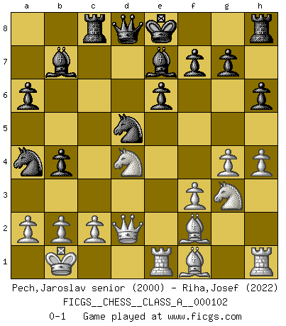 Last move : 0-1 2011 December 14 4:25:35 [Event "FICGS__CHESS__CLASS_A__000102"] [Site "FICGS"] [Date "2011.08.08"] [Round "1"] [White "Pech,Jaroslav senior"] [Black "Riha,Josef"] [Result "0-1"] [WhiteElo "2000"] [BlackElo "2022"] 1.e4 c5 2.Nf3 d6 3.d4 cxd4 4.Nxd4 Nf6 5.Nc3 a6 6.Be3 e6 7.f3 b5 8.Qd2 Nbd7 9.g4 h6 10.O-O-O Bb7 11.h4 b4 12.Nce2 d5 13.exd5 Nxd5 14.Bf2 Rc8 15.Kb1 Be7 16.Ng3 N7b6 17.Re1 Na4 0-1 This chess game has been lost on time (started : 2011.08.08 15:47:15) Sicilian : Najdorf, Byrne (English) attack Queenside Castling by player White (move 10) Player Black won this chess game. Follow this game move after move (download)Later, I began to succeed in decisive games. Perhaps because I realized a very simple truth: not only was I worried, but also my opponent. (Mikhail Tal) Es liegt in der Natur, vernüftig zu denken und unlogisch zu handeln. (Anatole France) Si yo gano un torneo, yo lo gano por mí mismo. Yo hago las jugadas. Nadie me ayuda. (Bobby Fischer) Karpov est une pièce de musée. (Garry Kasparov) Heh, heh, heh. Time to abandon ship. (General Grievous in Star Wars ep.3)