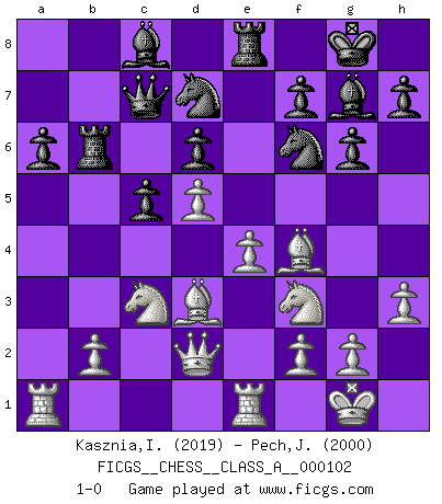 Last move : 1-0 2011 December 18 16:39:5 [Event "FICGS__CHESS__CLASS_A__000102"] [Site "FICGS"] [Date "2011.08.08"] [Round "1"] [White "Kasznia,Ireneusz"] [Black "Pech,Jaroslav senior"] [Result "1-0"] [WhiteElo "2019"] [BlackElo "2000"] 1.d4 Nf6 2.c4 c5 3.d5 e6 4.Nc3 exd5 5.cxd5 d6 6.e4 g6 7.Nf3 Bg7 8.h3 O-O 9.Bd3 a6 10.a4 Nbd7 11.O-O Re8 12.Bf4 Qc7 13.a5 Rb8 14.Re1 b6 15.axb6 Rxb6 16.Qd2 1-0 This chess game has been lost on time (started : 2011.08.08 15:47:15) Benoni : Classical with e4 and Nf3 Kingside Castling by player Black (move 8) Kingside Castling by player White (move 11) Player White won this chess game. Follow this game move after move (download)Excellence at Chess is one mark of a scheming mind. (Sir Arthur Conan Doyle) Im Internet Chess Club betrug mein Rating vorübergehend 3350 ELO-Punkte. (Sergej Karjakin) De eso se trata el Ajedrez. Un día le das una lección a tu oponente y al día siguiente el te da una a tí. (Bobby Fischer) Avec des compensations pour le matériel en plus... (Anonyme) Life doesn't imitate art, it imitates bad television. (Woody Allen)