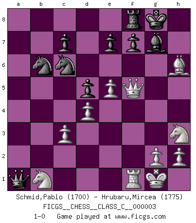 Last move : 1-0 2006 September 14 17:40:9 [Event "FICGS__CHESS__CLASS_C__000003"] [Site "FICGS"] [Date "2006.05.06"] [Round "1"] [White "Schmid,Pablo"] [Black "Hrubaru,Mircea"] [Result "1-0"] [WhiteElo "1700"] [BlackElo "1775"] 1.d4 Nf6 2.f3 g6 3.e4 d5 4.e5 Nfd7 5.f4 Nc6 6.Nf3 Nb6 7.a4 Bg7 8.a5 Nc4 9.a6 O-O 10.axb7 Bxb7 11.b3 Nb6 12.Bd3 a5 13.O-O a4 14.bxa4 Nxa4 15.c3 Nb6 16.Rxa8 Qxa8 17.f5 Ba6 18.Ng5 Bxd3 19.Qxd3 h6 20.Nh3 gxf5 21.Qxf5 Qa1 22.Bxh6 1-0 Paleface attack Kingside Castling by player Black (move 9) Kingside Castling by player White (move 13) Player White won this chess game. Follow this game move after move (download)I'm not afraid of Spassky. The world knows I'm the best. You don't need a match to prove it. (Bobby Fischer) Sicherlich können nur Meister einen Stil haben. Daß ein nicht-Meister auch nur ein einziges Mal in seinem Leben eine Partie folgerecht durchführte, habe ich niemals bemerkt. (Emanuel Lasker) Personalmente, yo prefiero mirar hacia el futuro en donde un programa de computadora gane el título mundial de Ajedrez. La humanidad necesita una lección de humildad. (Richard Dawkings) On est toujours la mazette de quelqu'un d'autre. (Anonyme) Luck is what you have left over after you give 100 percent. (Langston Coleman)