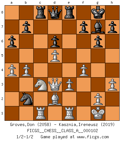 Last move : 1/2-1/2 2011 September 7 11:5:22 [Event "FICGS__CHESS__CLASS_A__000102"] [Site "FICGS"] [Date "2011.08.08"] [Round "1"] [White "Groves,Don"] [Black "Kasznia,Ireneusz"] [Result "1/2-1/2"] [WhiteElo "2058"] [BlackElo "2019"] 1.c4 c5 2.Nf3 g6 3.e3 Nf6 4.d4 Bg7 5.d5 O-O 6.Nc3 d6 7.Bd3 e6 8.O-O exd5 9.cxd5 Bg4 10.h3 Bxf3 11.Qxf3 Nbd7 12.Qe2 Re8 13.Rd1 a6 14.a4 Ne5 15.Bc2 c4 16.f4 Nd3 17.Bxd3 cxd3 18.Qxd3 Nd7 19.b4 Rc8 20.Bd2 Nb6 21.Rac1 Nc4 22.Re1 Nb2 23.Qb1 Nc4 24.Qd3 Nb2 1/2-1/2 English : Symmetrical variation Kingside Castling by player Black (move 5) Kingside Castling by player White (move 8) This chess game ended in a draw. Follow this game move after move (download)It's just you and your opponent at the board and you're trying to prove something. (Bobby Fischer) Wenn ich Weiß habe gewinne ich weil ich Weiß habe, wenn ich Schwarz habe gewinne ich weil ich Bogoljubov bin. (Efim Bogoljubov) Si no le temes a Spassky, entonces elimino el elemento del dinero. (Jim Slater) Que feriez-vous si vous étiez en train de jouer aux échecs et que la fin du monde arrive ? Je continuerais à jouer. (Saint Borromée) Children in the dark cause accidents, accidents in the dark cause children. (Unknown)