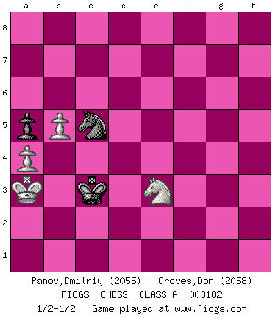 Last move : 1/2-1/2 2011 October 25 6:56:23 [Event "FICGS__CHESS__CLASS_A__000102"] [Site "FICGS"] [Date "2011.08.08"] [Round "1"] [White "Panov,Dmitriy"] [Black "Groves,Don"] [Result "1/2-1/2"] [WhiteElo "2055"] [BlackElo "2058"] 1.e4 e6 2.d4 d5 3.e5 c5 4.c3 Nc6 5.Nf3 Qb6 6.a3 c4 7.Nbd2 Na5 8.Be2 Bd7 9.O-O Ne7 10.Rb1 Qc7 11.Re1 h6 12.Nf1 Ng6 13.Be3 Be7 14.N3d2 Bc6 15.Qc2 Qd7 16.Bd1 O-O 17.f4 Bh4 18.Ng3 Nb3 19.Nf3 Bxg3 20.hxg3 Ba4 21.Qf2 Na5 22.Bxa4 Qxa4 23.g4 Qd7 24.Qc2 f5 25.exf6 Rxf6 26.g5 hxg5 27.Nxg5 Nc6 28.g3 Re8 29.Kg2 Nf8 30.Rh1 Rh6 31.Rbe1 Nd8 32.Rxh6 gxh6 33.Nf3 Qh7 34.Qxh7+ Nxh7 35.g4 Kg7 36.Ne5 Rf8 37.a4 Nf6 38.Kf3 a5 39.Bc1 Nf7 40.Rh1 Rg8 41.f5 exf5 42.gxf5 Ng5+ 43.Bxg5 hxg5 44.Rg1 Ne4 45.Nxc4 Rh8 46.Nb6 Rh3+ 47.Ke2 Rh2+ 48.Kd3 Rh3+ 49.Kc2 Rh2+ 50.Kc1 Kf6 51.Rf1 g4 52.Nxd5+ Kf7 53.Re1 Nf6 54.Ne3 g3 55.Rg1 Ne4 56.Nf1 Rh3 57.Kc2 Kf6 58.Ne3 Ng5 59.Kb3 Nf3 60.Rd1 Rh4 61.Rd3 Rf4 62.Ka3 Kg5 63.Ng2 Rxf5 64.d5 Rf8 65.d6 Kg4 66.d7 Rd8 67.Rd5 Ng5 68.Rd4+ Kf3 69.Nh4+ Ke3 70.Rg4 Ne4 71.Nf5+ Kf3 72.Rg7 Kf4 73.Nd4 Nc5 74.Ne2+ Kf3 75.Nxg3 Rxd7 76.Rxd7 Nxd7 77.Nf5 Ke2 78.b3 Kd3 79.Nd6 b6 80.Kb2 Nc5 81.Nc8 Nd7 82.Ne7 Nc5 83.Nd5 Nd7 84.Ka2 Kc2 85.Ka3 Nc5 86.b4 Na6 87.c4 Kd3 88.b5 Nc5 89.Nxb6 Kc3 90.Nd5+ Kxc4 91.Ne3+ Kc3 1/2-1/2 French : Advance, Paulsen attack Kingside Castling by player White (move 9) Kingside Castling by player Black (move 16) 10 pieces endgame at move 76 : White KRNPPP , Black KNPP WHITE : King + 1 Rook 1 Knight 3 Pawns BLACK : King + 1 Knight 2 Pawns 9 pieces endgame at move 76 : White KNPPP , Black KNPP WHITE : King + 1 Knight 3 Pawns BLACK : King + 1 Knight 2 Pawns 8 pieces endgame at move 89 : White KNPPP , Black KNP WHITE : King + 1 Knight 3 Pawns BLACK : King + 1 Knight 1 Pawn 7 pieces endgame at move 90 : White KNPP , Black KNP WHITE : King + 1 Knight 2 Pawns BLACK : King + 1 Knight 1 Pawn This chess game ended in a draw. Follow this game move after move (download)The stomach is an essential part of the Chess master. (Bent Larsen) Ein guter Spieler hat immer Glück. (José Raúl Capablanca) Tu sabes, camarada Pachman, no disfruto el ser un Ministro, preferería jugar al Ajedrez como tu. (Che Guevara) Les écrivains ont utilisé les échecs pour analyser les côtés extrêmes de la nature humaine. Dans ce cadre, les échecs offrent un champ d'expérimentation idéal. Mais on pourrait faire la même chose avec la peinture. Et là, en vous référant à Van Gogh, vous ne tirerez pas de conclusion définitive sur les peintres. (Gary Kasparov) Life is like a play: it's not the length but the excellence of the acting that matters. (Seneca)