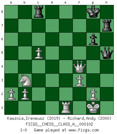 Last move : 1-0 2011 September 27 4:39:50 [Event "FICGS__CHESS__CLASS_A__000102"] [Site "FICGS"] [Date "2011.08.08"] [Round "1"] [White "Kasznia,Ireneusz"] [Black "Richard,Andy"] [Result "1-0"] [WhiteElo "2019"] [BlackElo "2000"] 1.d4 d5 2.c4 c6 3.e3 Nf6 4.Nf3 Bf5 5.cxd5 cxd5 6.Qb3 Qd7 7.Bb5 Nc6 8.Ne5 Qc8 9.O-O a6 10.Nxc6 bxc6 11.Ba4 Bd7 12.Nc3 g6 13.e4 dxe4 14.Qc2 Bg7 15.Nxe4 Nd5 16.Bg5 O-O 17.Qd2 Bf5 18.Ng3 Bd7 19.Rac1 Rb8 20.Bb3 Be6 21.Rfe1 Qd7 22.Ne4 Nc7 23.Bf4 Rbc8 24.Bh6 Bxb3 25.Bxg7 Kxg7 26.Nc5 Qd6 27.Nxb3 Rfd8 28.Re4 Ne6 29.Qc3 Kg8 30.h4 c5 31.dxc5 Qd5 32.Re5 Qc6 33.Qc4 Kg7 34.h5 Qd7 35.Rce1 Kg8 36.Qxa6 Nf4 37.hxg6 hxg6 38.Rxe7 Qf5 39.R7e3 Qd5 40.Qf1 Kg7 41.Re4 Rh8 42.Rxf4 Qh5 43.Rxf7+ Kg8 44.Rh7 Rxh7 45.Qc4+ Kf8 46.Qf4+ Kg8 47.f3 1-0 QGD Slav defense Kingside Castling by player White (move 9) Kingside Castling by player Black (move 16) Player White won this chess game. Follow this game move after move (download)A bad day of Chess is better than any good day at work. (Anonymous) Wenn ein Kopf und ein Buch zusammenstoßen und es klingt hohl, ist es denn allemal im Buche? (Georg Christoph Lichtenberg) Hay jugadores fuertes y personas amables y yo soy un jugador fuerte. (Bobby Fischer) Pour se monter efficace, un Cavalier a besoin d'avant-postes ! Les Cavaliers font les meilleurs bloqueurs de pions passés. You can't play chess if you're groggy from pills. (Anatoly Karpov)