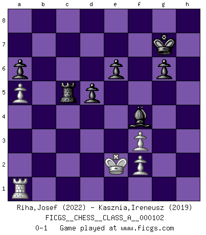 Last move : 0-1 2011 September 19 19:20:32 [Event "FICGS__CHESS__CLASS_A__000102"] [Site "FICGS"] [Date "2011.08.08"] [Round "1"] [White "Riha,Josef"] [Black "Kasznia,Ireneusz"] [Result "0-1"] [WhiteElo "2022"] [BlackElo "2019"] 1.d4 Nf6 2.Nf3 e6 3.c4 d5 4.Bg5 Be7 5.Nc3 h6 6.Bxf6 Bxf6 7.e3 O-O 8.Rc1 c6 9.Bd3 Nd7 10.cxd5 exd5 11.b4 b5 12.O-O Nb6 13.a4 a6 14.Rb1 Nc4 15.h3 Re8 16.a5 Be6 17.Ne2 Be7 18.Nf4 Bd6 19.Nxe6 Rxe6 20.Qb3 Rf6 21.Rfd1 Qe7 22.Be2 Re8 23.Re1 Qd7 24.Qc3 Bc7 25.Rbc1 R8e6 26.Bd3 Re8 27.Be2 Qe7 28.Bd3 Qd6 29.Kf1 Rxf3 30.gxf3 Qh2 31.Bxc4 bxc4 32.Ke2 Bg3 33.Rf1 g6 34.Qe1 Bf4 35.Rc3 Qxh3 36.Qd1 Kg7 37.Rh1 Qd7 38.Rc2 Bd6 39.Rb2 Rb8 40.Qc2 Rb5 41.Rhb1 h5 42.Qc3 h4 43.e4 Bf4 44.Rg1 h3 45.R2b1 h2 46.Rg4 Bd6 47.Rh1 Rxb4 48.e5 Qf5 49.Qd2 c3 50.Qg5 Rb2+ 51.Ke3 Qxg5+ 52.Rxg5 c2 53.Rg2 Bb4 54.Rgxh2 c1Q+ 55.Rxc1 Bd2+ 56.Kd3 Bxc1 57.Rg2 Bd2 58.Rg1 Bf4 59.Rf1 Rb3+ 60.Ke2 Rb5 61.Ra1 c5 62.dxc5 Rxc5 63.e6 fxe6 0-1 Queen's pawn game Kingside Castling by player Black (move 7) Kingside Castling by player White (move 12) Promotion Queen by player Black (move 54) Player Black won this chess game. Follow this game move after move (download)A thorough understanding of the typical mating continuations makes the most complicated sacrificial combinations leading up to them not only not difficult, but almost a matter of course. (Siegbert Tarrasch) Schach ist die gewalttätigste aller Sportarten. (Garry Kasparov) Dejen al perfeccionista jugar por correo. (Yasser Seirawan) Seul un grand joueur sait à quel point il joue faiblement. (Xavier Tartacover) Fortune favours the audacious. (Desiderius Erasmus)