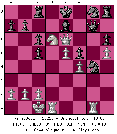 Last move : 1-0 2011 August 23 22:53:9 [Event "FICGS__CHESS__UNRATED_TOURNAMENT__000019"] [Site "FICGS"] [Date "2011.08.09"] [Round "1"] [White "Riha,Josef"] [Black "Brumec,Fredi"] [Result "1-0"] [WhiteElo "2022"] [BlackElo "1800"] 1.e4 d6 2.d4 c6 3.Nc3 h6 4.Nf3 Bg4 5.h3 Bh5 6.Bd3 Nd7 7.Qe2 e5 8.g4 Bg6 9.Be3 Be7 10.O-O-O Qc7 11.h4 f6 12.h5 Bf7 13.Bc4 Bxc4 14.Qxc4 exd4 15.Nxd4 Ne5 16.Ne6 Qd7 17.Qb3 Bf8 18.f4 Nxg4 19.Bc5 Qf7 20.Rhg1 f5 21.e5 dxc5 22.Nb5 Rc8 23.Nxg7+ Qxg7 24.Qe6+ Be7 25.Nd6+ 1-0 King's pawn Opening Queenside Castling by player White (move 10) Player White won this chess game. Follow this game move after move (download)All I want to do, ever, is just play Chess. (Bobby Fischer) Kritik überlasse ich den Spießern. Ich zeige nichts, wofür ich mich schämen muss. (Alexandra Kosteniuk) El Peón aislado arroja penumbra sobre todo el tablero. (Aaron Nimzovich) En blitz, le Cavalier l'emporte sur le Fou. (Vlastimil Hort) History is the quarrels of popes and kings, with wars or pestilences in every page; the men all so good for nothing, and hardly any women at all. (Jane Austen)