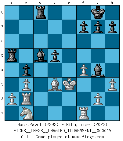 Last move : 0-1 2011 August 20 16:58:26 [Event "FICGS__CHESS__UNRATED_TOURNAMENT__000019"] [Site "FICGS"] [Date "2011.08.09"] [Round "1"] [White "Hase,Pavel"] [Black "Riha,Josef"] [Result "0-1"] [WhiteElo "2292"] [BlackElo "2022"] 1.e4 c5 2.Nf3 Nc6 3.d4 cxd4 4.Nxd4 Nf6 5.Nc3 d6 6.Bg5 e6 7.Qd2 a6 8.O-O-O Bd7 9.Be2 b5 10.f4 b4 11.Nb1 Nxe4 12.Bxd8 Nxd2 13.Nxc6 Bxc6 14.Rxd2 Rxd8 15.Bxa6 d5 16.c4 Bd6 17.Rf1 O-O 18.cxd5 exd5 19.Rc2 Bd7 20.Bd3 Rfe8 21.Kd2 Ra8 22.b3 Rec8 23.Rb2 Ra5 24.Ke3 Bg4 25.h3 Bc5+ 0-1 Sicilian defense Queenside Castling by player White (move 8) Kingside Castling by player Black (move 17) Player Black won this chess game. Follow this game move after move (download)The laws of Chess do not permit a free choice: you have to move whether you like it or not. (Emanuel Lasker) Moralische Siege zählen nicht. (Savielly Grigorievitsch Tartakower) Del Ajedrez se ha dicho que la vida no es lo suficientemente larga para él, pero eso es culpa de la vida, no del Ajedrez. (William Ewart Napier) Les Echecs ne sont pas pour les âmes timides. Ils requièrent un homme entier, qui ne s'arrête pas aveuglément à ce qui a été déjà établi, mais qui tente individuellement de sonder les profondeurs du jeu. (W. Steinitz) Wisdom doesn't necessarily come with age. Sometimes age just shows up all by itself. (Tom Watson)