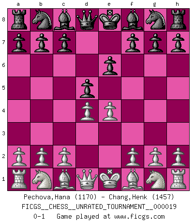Last move : 0-1 2011 September 23 22:48:42 [Event "FICGS__CHESS__UNRATED_TOURNAMENT__000019"] [Site "FICGS"] [Date "2011.08.09"] [Round "1"] [White "Pechova,Hana"] [Black "Chang,Henk"] [Result "0-1"] [WhiteElo "1170"] [BlackElo "1457"] 1.e4 e6 2.d4 d5 0-1 This chess game has been lost on time (started : 2011.08.09 8:56:28) French defense Player Black won this chess game. Follow this game move after move (download)The passed pawn is a criminal, who should be kept under lock and key. Mild measures, such as police surveillance, are not sufficient. (Nimzovitch) Ich glaube, ich kenne inzwischen die Gründe für mein Versagen: schachliche Charakterfehler. Ich war nie ein Wunderkind und in meiner gesamten menschlichen Entwicklung immer zu langsam. (Viktor Kortschnoi) El Ajedrez es de 30 a 40 por ciento psicología. Uno no cuenta con esto cuando se juega contra una computadora. No lo puedo confundir. (Judith Polgar) Fischer est le meilleur joueur du monde et Karpov n'est qu'un joueur de bistrot. (Garry Kasparov, agé de 16 ans) Train yourself to let go of everything you fear to lose. (Master Yoda in Star Wars ep.3)