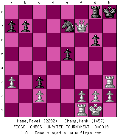 Last move : 1-0 2011 September 8 0:39:18 [Event "FICGS__CHESS__UNRATED_TOURNAMENT__000019"] [Site "FICGS"] [Date "2011.08.09"] [Round "1"] [White "Hase,Pavel"] [Black "Chang,Henk"] [Result "1-0"] [WhiteElo "2292"] [BlackElo "1457"] 1.e4 e6 2.d4 d5 3.Nc3 Bb4 4.e5 c5 5.a3 Bxc3+ 6.bxc3 Ne7 7.Qg4 O-O 8.Nf3 Qc7 9.Bd3 cxd4 10.O-O dxc3 11.Bxh7+ Kxh7 12.Ng5+ Kg6 13.Nxe6 Kh7 14.Qh5+ Kg8 15.Nxc7 Bf5 16.Nxa8 Nbc6 17.Nc7 Nxe5 18.Nxd5 Nxd5 19.Qxf5 Re8 20.Bf4 f6 21.Rad1 Ne7 22.Qe6+ Kh8 23.Bxe5 fxe5 24.Rd3 g6 25.Qf7 Rg8 26.Rh3+ 1-0 French : Winawer, Advance, poisoned pawn variation Kingside Castling by player Black (move 7) Kingside Castling by player White (move 10) Player White won this chess game. Follow this game move after move (download)Chess is mental torture. (Garry Kasparov) Das Blackmar-Diemer-Gambit verändert den ganzen Menschen! (Emil Joseph Diemer) Me gusta decir que Bobby Fischer fue el mejor jugador que jamás haya existido. Pero lo que hizo de Fischer un genio, fue su habilidad de mezclar una frescura y pragmatismo Americano con ideas Rusas acerca de la estrategia. (Bruce Pandolfini) Aux échecs, les retours au sommet sont rares : les dommages psychologiques consécutifs à une défaite sont trop sévères. (Daily Telegraph) Memory is a crazy woman that hoards colored rags and throws away food. (Austin O'Malley)