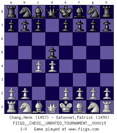 Last move : 1-0 2011 September 28 23:10:19 [Event "FICGS__CHESS__UNRATED_TOURNAMENT__000019"] [Site "FICGS"] [Date "2011.08.09"] [Round "1"] [White "Chang,Henk"] [Black "Satonnet,Patrick"] [Result "1-0"] [WhiteElo "1457"] [BlackElo "1490"] 1.d4 d5 2.c4 1-0 This chess game has been lost on time (started : 2011.08.09 8:56:28) Queen's Gambit Player White won this chess game. Follow this game move after move (download)In the perfect Chess combination as in a first-rate short story, the whole plot and counter-plot should lead up to a striking finale, the interest not being allayed until the very last moment. (Yates and Winter) Garry Kasparov war erst in der Großmeister-Organisation GMA, dann in der Profischach-Vereinigung PCA, zum Schluss kehrte er wieder in den Schoß der FIDE zurück. Aber gut, manche Leute sind flexibel (Viswanathan Anand) De todos mis libros Rusos, la defensa contiene y difunde el 'calor' mas grande que pudiese verse extraño al observar lo supremamente abstracto que el Ajedrez supuestamente es. (Vladimir Nabokov) Les Echecs sont affaire de jugement sensible. Savoir quand frapper et quand esquiver. (Fischer) Without enthusiasm, virtue functions not at all, and vice only poorly. (Mignon McLaughlin, The Neurotic's Notebook, 1960)