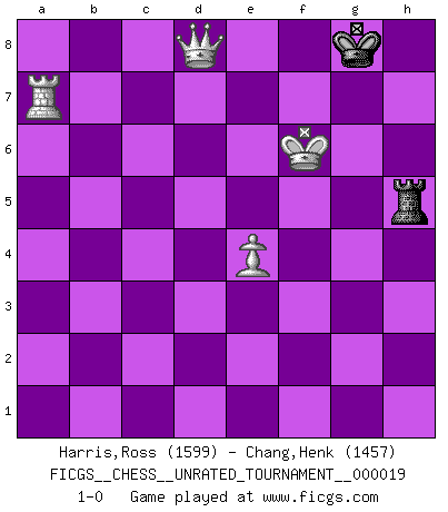 Last move : 1-0 2011 October 13 0:27:44 [Event "FICGS__CHESS__UNRATED_TOURNAMENT__000019"] [Site "FICGS"] [Date "2011.08.09"] [Round "1"] [White "Harris,Ross"] [Black "Chang,Henk"] [Result "1-0"] [WhiteElo "1599"] [BlackElo "1457"] 1.d4 d5 2.Nf3 Nf6 3.Bf4 Bf5 4.e3 e6 5.c4 c5 6.cxd5 exd5 7.Bxb8 Rxb8 8.Qa4+ Bd7 9.Qxa7 c4 10.Ne5 Bb5 11.Nc3 Ba6 12.Nc6 bxc6 13.Qxa6 Qc7 14.g3 Bd6 15.Bg2 O-O 16.Qa4 Rxb2 17.O-O Qb7 18.Rab1 Rb8 19.Rxb2 Qxb2 20.Qxc6 Qxc3 21.Qxd6 Qb4 22.Qxb4 Rxb4 23.Ra1 c3 24.Rc1 Rc4 25.Kf1 Ne4 26.Bxe4 dxe4 27.Ke2 Ra4 28.Rc2 f5 29.f3 Kf7 30.fxe4 fxe4 31.g4 Ke6 32.h4 Kd5 33.Rxc3 Rxa2+ 34.Kf1 Ra1+ 35.Kf2 Ra2+ 36.Kg3 Re2 37.Rc5+ Kd6 38.Kf4 Rf2+ 39.Kxe4 Rh2 40.h5 Rh4 41.Rg5 g6 42.hxg6 hxg6 43.Rxg6+ Ke7 44.Kf5 Rh3 45.e4 Kf7 46.Ra6 Rf3+ 47.Ke5 Rg3 48.Kf4 Rg1 49.d5 Rf1+ 50.Ke5 Rg1 51.Ra7+ Kg8 52.d6 Rxg4 53.d7 Rg5+ 54.Kf6 Rh5 55.d8Q+ 1-0 Queen's Bishop game Kingside Castling by player Black (move 15) Kingside Castling by player White (move 17) 10 pieces endgame at move 39 : White KRPPPP , Black KRPP WHITE : King + 1 Rook 4 Pawns BLACK : King + 1 Rook 2 Pawns 9 pieces endgame at move 42 : White KRPPPP , Black KRP WHITE : King + 1 Rook 4 Pawns BLACK : King + 1 Rook 1 Pawn 8 pieces endgame at move 42 : White KRPPP , Black KRP WHITE : King + 1 Rook 3 Pawns BLACK : King + 1 Rook 1 Pawn 7 pieces endgame at move 43 : White KRPPP , Black KR WHITE : King + 1 Rook 3 Pawns BLACK : King + 1 Rook 6 pieces endgame at move 52 : White KRPP , Black KR WHITE : King + 1 Rook 2 Pawns BLACK : King + 1 Rook Promotion Queen by player White (move 55) Player White won this chess game. Follow this game move after move (download)A Chess game is divided into three stages: the first, when you hope you have the advantage, the second when you believe you have an advantage, and the third... when you know you're going to lose ! (Savielly Tartakower) Ich kenne Menschen, die allen Willen der Welt besitzen und doch nicht Schach spielen können. (Robert James Fischer) ¿Esta Bobby Fischer algo cuerdo?. (Salo Flohr) Karpov est une pièce de musée. (Garry Kasparov) Those who make the worst use of their time are the first to complain of its brevity. (Jean de la Bruyere)