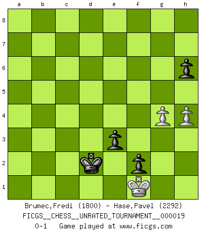 Last move : 0-1 2011 August 30 18:3:17 [Event "FICGS__CHESS__UNRATED_TOURNAMENT__000019"] [Site "FICGS"] [Date "2011.08.09"] [Round "1"] [White "Brumec,Fredi"] [Black "Hase,Pavel"] [Result "0-1"] [WhiteElo "1800"] [BlackElo "2292"] 1.e4 e6 2.d4 d5 3.e5 c5 4.c3 Qb6 5.a3 Bd7 6.b4 cxd4 7.cxd4 a5 8.bxa5 Rxa5 9.Nc3 Nc6 10.Nf3 f6 11.Be2 fxe5 12.Nxe5 Qxd4 13.Nxc6 Qxd1+ 14.Bxd1 Bxc6 15.O-O Nf6 16.Bf3 Bd6 17.Re1 Kf7 18.Bb2 Rha8 19.Ne2 Bxa3 20.Bxf6 gxf6 21.Nd4 Bd7 22.Bh5+ Ke7 23.Nf5+ Kd8 24.Nd4 Bb2 25.Rxa5 Rxa5 26.Nb3 Ra3 27.Nc5 Bc3 28.Nxb7+ Kc7 29.Rb1 Ra1 30.Rxa1 Bxa1 31.Nc5 Bc8 32.Bf7 Kd6 33.Nb3 Bc3 34.Bg8 h6 35.g4 e5 36.h3 f5 37.f3 Bd7 38.Kf2 Ba4 39.Nc1 Bd2 40.Nd3 e4 41.Ne1 Bb5 42.Nc2 Bd3 43.Ne3 f4 44.Nf5+ Ke5 45.fxe4 dxe4 46.Nh4 e3+ 47.Kg1 Be4 48.Bc4 Be1 49.Ng2 Bf2+ 50.Kf1 f3 51.Ne1 Kd4 52.Ba6 Bxe1 53.Kxe1 f2+ 54.Kf1 Bd3+ 55.Bxd3 Kxd3 56.h4 Kd2 0-1 French : Advance variation Kingside Castling by player White (move 15) 10 pieces endgame at move 52 : White KBPP , Black KBBPPP WHITE : King + 1 Bishop 2 Pawns BLACK : King + 2 Bishops 3 Pawns 9 pieces endgame at move 53 : White KBPP , Black KBPPP WHITE : King + 1 Bishop 2 Pawns BLACK : King + 1 Bishop 3 Pawns 8 pieces endgame at move 55 : White KBPP , Black KPPP WHITE : King + 1 Bishop 2 Pawns BLACK : King + 3 Pawns 7 pieces endgame at move 55 : White KPP , Black KPPP WHITE : King + 2 Pawns BLACK : King + 3 Pawns Player Black won this chess game. Follow this game move after move (download)Botvinnik tried to take the mystery out of Chess, always relating it to situations in ordinary life. He used to call Chess a typical inexact problem similar to those which people are always having to solve in everyday life. (Garry Kasparov) Du weisst es gibt ein Problem mit Computern und Fernschach, wenn jeder eine Rating von 2450 hat. (John Christen Knudsen) La pasion por jugar al Ajedrez es una de las mas inexplicables en el mundo. (H.G. Wells) Le pion, dans sa simplicité, marche droit devant lui, mais lorsqu'il prend, il le fait obliquement? Ainsi l'homme, tant qu'il reste pauvre, marche dans la droiture et vit honnêtement, mais lorsqu'il recherche les honneurs, il flatte, se parjure et, par les voies obliques, cherche une position supérieure sur l'échiquier du monde. (Jean de Galles) Information on the Internet is subject to the same rules and regulations as conversation at a bar. (George Lundberg)
