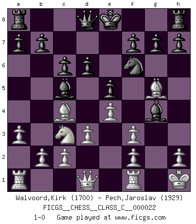 Last move : 1-0 2007 February 20 5:11:16 [Event "FICGS__CHESS__CLASS_C__000022"] [Site "FICGS"] [Date "2006.12.29"] [Round "1"] [White "Walvoord,Kirk"] [Black "Pech,Jaroslav"] [Result "1-0"] [WhiteElo "1700"] [BlackElo "1929"] 1.e4 e5 2.Nf3 Nc6 3.Bc4 Nf6 4.Nc3 Bc5 5.O-O d6 6.a3 Bg4 7.d3 Nd4 8.Kh1 c6 9.Bg5 Nxf3 10.gxf3 1-0 This chess game has been lost on time (started : 2006.12.29 18:59:14) Two knights defense Kingside Castling by player White (move 5) Player White won this chess game. Follow this game move after move (download)The mistakes are there, waiting to be made. (Savielly Tartakower) Nicht daß Diemer aus Opportunismus Mitglied der NSDAP geworden wäre. Er war ein Fanatiker, in allem, was er tat. (Hans Ree) En la vida, como en el Ajedrez, los Peones propios obstruyen nuestro camino. La gran fortuna de un hombre, su comodidad, placer, hijos, libros, que deberían ayudarle a ganar, con mucha frecuencia lo ponen en Jaque Mate. (Charles Buxton) La tactique, c'est ce que vous faites quand il y a quelque chose à faire; la stratégie, c'est ce que vous faites quand il n'y a rien à faire. (Savielli Tartacower) Horse racing is animated roulette. (Roger Kahn)