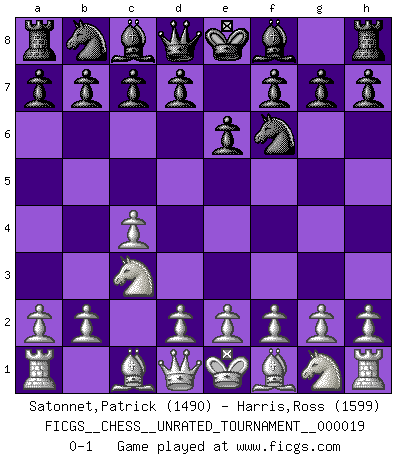 Last move : 0-1 2011 September 25 22:54:48 [Event "FICGS__CHESS__UNRATED_TOURNAMENT__000019"] [Site "FICGS"] [Date "2011.08.09"] [Round "1"] [White "Satonnet,Patrick"] [Black "Harris,Ross"] [Result "0-1"] [WhiteElo "1490"] [BlackElo "1599"] 1.c4 Nf6 2.Nc3 e6 0-1 This chess game has been lost on time (started : 2011.08.09 8:56:28) English Opening Player Black won this chess game. Follow this game move after move (download)Chess is a more highly symbolic game, but the aggressions are therefore even more frankly represented in the play. It probably began as a war game; that is, the representation of a miniature battle between the forces of two kingdoms. (Karl Meninger) Sie bekommen vielleicht den Eindruck, dass die Spitzenspieler überhaupt gar nicht so stark sind. Aber das stimmt nicht. Es ist eine Illusion. Mit einem Computer an der Seite ist es sehr leicht, Urteile zu fällen, aber wenn man alleine am Brett sitzt, sieht die Sache ganz anders aus. (Vladimir Kramnik) El Ajedrez es realmente noventa y nueve por ciento calculación. (Soltis) Les échecs sont plus proches de l'art de l'assassinat que de l'art de la guerre. (Arturo Perez-Reverte) Whatever you do, don't be bored. This is absolutely the most exciting time we could have possibly hoped to be alive. And things are just starting. (From movie Waking life)