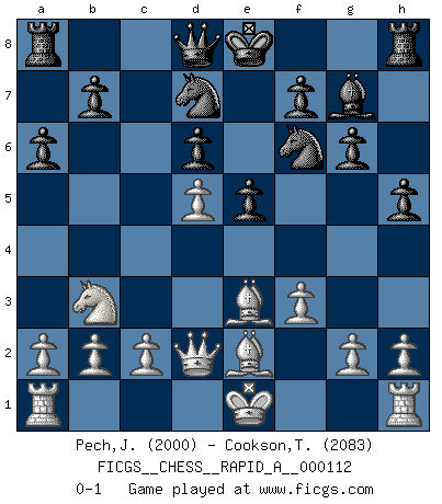 Last move : 0-1 2011 November 21 1:18:42 [Event "FICGS__CHESS__RAPID_A__000112"] [Site "FICGS"] [Date "2011.08.09"] [Round "1"] [White "Pech,Jaroslav senior"] [Black "Cookson,Timothy"] [Result "0-1"] [WhiteElo "2000"] [BlackElo "2083"] 1.e4 c5 2.Nf3 d6 3.d4 cxd4 4.Nxd4 Nf6 5.Nc3 a6 6.Be3 e5 7.Nb3 Be6 8.f3 h5 9.Nd5 Bxd5 10.exd5 Nbd7 11.Qd2 g6 12.Be2 Bg7 0-1 This chess game has been lost on time (started : 2011.08.09 14:49:42) Sicilian : Najdorf, Byrne (English) attack Player Black won this chess game. Follow this game move after move (download)Chess is everything: art, science and sport. (Anatoly Karpov) Ich war schon mal beim Dopingtest. Da musste ich Urin abgeben, während Dritte zusahen. (Elisabeth Pähtz) Fischer deseaba darle a los Rusos una sopa de su propia medicina. (Larry Evans) A chaque perte on perd un peu de soi. (Joël Lautier) Don't be irreplaceable, if you can't be replaced, you can't be promoted. (Dan Rotaru)