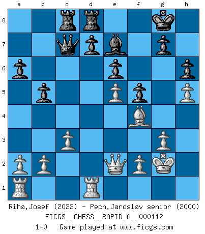 Last move : 1-0 2011 November 21 1:18:42 [Event "FICGS__CHESS__RAPID_A__000112"] [Site "FICGS"] [Date "2011.08.09"] [Round "1"] [White "Riha,Josef"] [Black "Pech,Jaroslav senior"] [Result "1-0"] [WhiteElo "2022"] [BlackElo "2000"] 1.e4 c5 2.c3 Nf6 3.e5 Nd5 4.d4 cxd4 5.Qxd4 e6 6.Nf3 Nc6 7.Qe4 f5 8.Qe2 Qc7 9.g3 b6 10.Bg2 Ncb4 11.Qd1 Ba6 12.Bf1 Bxf1 13.Kxf1 Nc6 14.Qe2 h6 15.h4 Na5 16.Kg2 Be7 17.Rd1 a6 18.Nbd2 b5 19.Nb3 O-O 20.Nxa5 Qxa5 21.Ne1 Qc7 22.Nd3 Rfd8 23.Nf4 Nxf4+ 24.Bxf4 Rac8 25.h5 1-0 This chess game has been lost on time (started : 2011.08.09 14:49:42) Sicilian : Alapin's variation (2.c3) Kingside Castling by player Black (move 19) Player White won this chess game. Follow this game move after move (download)Good positions don't win games, good moves do. (Gerald Abrahams) Ein guter Spieler hat immer Glück. (José Raúl Capablanca) El juego de Damas es para vagabundos. (Paul Morphy) Je crois qu'il existe des manières très spécifiques de jouer efficacement contre une machine. Evidemment, nous n'avons aucune chance en technique pure, parce que l'ordinateur calcule de manière parfaite. Mais lorsque nous faisons appel à notre cerveau, en utilisant l'intuition et la compréhension, alors nous restons beaucoup plus forts. (Anatoli Karpov) CHESS, n. f. [echecs, Fr.] A nice and abstruse game, in which two sets of puppets are moved in opposition to each other. (Dr Samuel Johnson, A Dictionary Of The English Language, 1755)