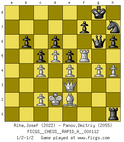 Last move : 1/2-1/2 2011 September 13 14:46:3 [Event "FICGS__CHESS__RAPID_A__000112"] [Site "FICGS"] [Date "2011.08.09"] [Round "1"] [White "Riha,Josef"] [Black "Panov,Dmitriy"] [Result "1/2-1/2"] [WhiteElo "2022"] [BlackElo "2055"] 1.Nc3 Nf6 2.e4 e5 3.Nf3 Nc6 4.Bb5 Bb4 5.O-O O-O 6.d3 d6 7.Bg5 Bxc3 8.bxc3 Qe7 9.Re1 h6 10.Bh4 Nd8 11.d4 c6 12.Bd3 Bg4 13.h3 Bxf3 14.Qxf3 Ne6 15.Qf5 g5 16.Bg3 Ng7 17.Qf3 Ngh5 18.Bh2 Rfe8 19.a4 Nf4 20.Bxf4 gxf4 21.g3 fxg3 22.fxg3 Kg7 23.Qf2 Nh7 24.Rf1 Qd7 25.Kg2 Re6 26.Qe3 Rf6 27.Rxf6 Nxf6 28.Rf1 Qe6 29.Rf5 b6 30.g4 Rg8 31.Kf1 Nh7 32.a5 Rb8 33.Ke2 c5 34.Kd2 Rc8 35.axb6 axb6 36.h4 Kg8 37.d5 Qg6 38.Be2 Ra8 39.Qd3 Ra5 40.c4 Ra1 41.Qb3 Nf6 42.Qf3 Nh7 43.Qe3 Rh1 1/2-1/2 Dunst (Sleipner, Heinrichsen) Opening Kingside Castling by player White (move 5) Kingside Castling by player Black (move 5) This chess game ended in a draw. Follow this game move after move (download)A big shock; the best chess player in history has passed away. (Lajos Portisch, about Bobby Fischer's death) Aljechin war kein Nazi. Er war ein Opportunist. Ein schrecklicher Mann. Er liebte Geld über alles und würde für Geld ein Jude, ein Katolik oder ein Protestant werden. (Miguel Najdorf) Una clavada es mas poderosa que una espada. (Fred Reinfeld) La tactique, c'est ce que vous faites quand il y a quelque chose à faire; la stratégie, c'est ce que vous faites quand il n'y a rien à faire. (Savielli Tartacower) How many people work in NATO Headquarters ? - About half of them. (Dirk Stikker, NATO general secretary)