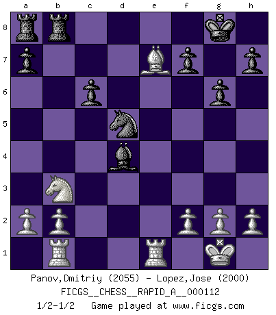 Last move : 1/2-1/2 2011 August 18 4:49:45 [Event "FICGS__CHESS__RAPID_A__000112"] [Site "FICGS"] [Date "2011.08.09"] [Round "1"] [White "Panov,Dmitriy"] [Black "Lopez,Jose"] [Result "1/2-1/2"] [WhiteElo "2055"] [BlackElo "2000"] 1.e4 c5 2.c3 Nf6 3.e5 Nd5 4.d4 cxd4 5.cxd4 d6 6.Nf3 Nc6 7.Bc4 Nb6 8.Bb5 dxe5 9.Nxe5 Bd7 10.Bxc6 Bxc6 11.Nxc6 bxc6 12.O-O g6 13.Re1 Bg7 14.Bg5 O-O 15.Bxe7 Qxd4 16.Qxd4 Bxd4 17.Nd2 Rfb8 18.Rab1 Nd5 19.Nb3 1/2-1/2 Sicilian : Alapin's variation (2.c3) Kingside Castling by player White (move 12) Kingside Castling by player Black (move 14) This chess game ended in a draw. Follow this game move after move (download)Only the player with the initiative has the right to attack. (Wilhelm Steinitz) Mit sehr nachdenklichem Gesicht schreitet Bobby durch den Turniersaal. Was ist passiert?, fragt Lombardy. Ich stehe schlecht, antwortet Fischer. Lombardy: Dann biete doch einfach Remis an. Fischer: So schlecht stehe ich nun auch wieder nicht! (Robert James Fischer) Me dio la sensación de como si yo estuviera jugando en contra del mismo Ajedrez. - al estar jugando en contra de Robert Fischer (Walter Shipman) Les Cavaliers se révèlent fort utiles dans les positions fermées. D'habitude, les Fous sont un peu plus forts que les Cavaliers dans les positions ouvertes. Qu'on le veuille ou non, il restera toujours des exceptions ! Crush them ! Make them suffer ! (General Grievous in Star Wars ep.3)