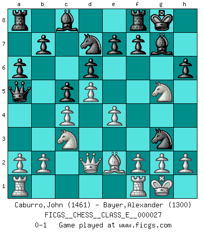 Last move : 0-1 2007 April 28 0:57:47 [Event "FICGS__CHESS__CLASS_E__000027"] [Site "FICGS"] [Date "2006.12.31"] [Round "1"] [White "Caburro,John"] [Black "Bayer,Alexander"] [Result "0-1"] [WhiteElo "1461"] [BlackElo "1300"] 1.d4 Nf6 2.c4 g6 3.Nc3 Bg7 4.e4 d6 5.Be2 O-O 6.Bg5 c5 7.d5 Qa5 8.Qd2 h6 9.Bh4 Nbd7 10.Nf3 a6 11.O-O g5 12.Bg3 Nh5 13.Nxg5 Nxg3 0-1 King's Indian : Averbakh, 6...c5 Kingside Castling by player Black (move 5) Kingside Castling by player White (move 11) Player Black won this chess game. Follow this game move after move (download)Bobby Fischer is the greatest Chess genius of all time ! (Alexander Kotov) Die Partien sind immer verschieden, die Interviews immer die gleichen. (Garry Kasparov) El Ajedrez no es una pizca de inferior al violín, y tenemos un gran número de violinistas profesionales. (Mikhail Botvinnik) Les sacrifices démontrent seulement que quelqu'un a gaffé. (Savielly Tartacover) Once you start thinking you have nothing left to learn, you have everything to learn. (Steve Badget)