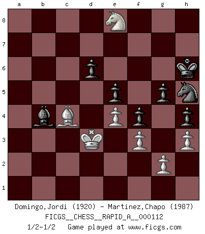 Last move : 1/2-1/2 2012 January 20 19:35:53 [Event "FICGS__CHESS__RAPID_A__000112"] [Site "FICGS"] [Date "2011.08.09"] [Round "1"] [White "Domingo,Jordi"] [Black "Martinez,Chapo"] [Result "1/2-1/2"] [WhiteElo "1920"] [BlackElo "1987"] 1.e4 c5 2.Nf3 Nc6 3.d4 cxd4 4.Nxd4 Nf6 5.Nc3 e5 6.Ndb5 d6 7.Bg5 a6 8.Na3 b5 9.Nd5 Be7 10.Bxf6 Bxf6 11.c4 b4 12.Nc2 a5 13.Be2 O-O 14.O-O Bg5 15.Qd3 Be6 16.Rfd1 Rb8 17.b3 g6 18.h3 Kg7 19.a3 bxa3 20.Rxa3 Bxd5 21.Qxd5 Qb6 22.Rd3 f5 23.Bf3 f4 24.Rd2 Rfd8 25.Qd3 Be7 26.Qc3 Rdc8 27.Rd5 Nb4 28.Rd2 Rc7 29.Qa1 a4 30.bxa4 Rxc4 31.Rb3 Qc5 32.Qd1 Bh4 33.Kh1 Na6 34.Rxb8 Nxb8 35.Be2 Rxa4 36.f3 Ra2 37.Nb4 Rxd2 38.Qxd2 Qa5 39.Qc3 Nc6 40.Nd5 Qa2 41.Bd3 Nd4 42.Qc7+ Kh6 43.Qc1 Qf2 44.Qg1 Qb2 45.Qb1 Qd2 46.Qf1 Kg5 47.Nb6 Qb4 48.Qb1 Qxb1+ 49.Bxb1 Be1 50.Bd3 Bb4 51.Nd5 Bc5 52.Nc3 Ne6 53.Kh2 Ng7 54.Nd5 Nh5 55.Nc7 Kh4 56.Bc4 Ng3 57.Ne8 Kg5 58.Ba6 Ba3 59.Bc4 h5 60.Nc7 Bb4 61.Ne8 h4 62.Ba6 Ba3 63.Bc4 Nh5 64.Kg1 Bb4 65.Kf2 Kh6 66.Ke2 g5 67.Kd3 1/2-1/2 Sicilian : Pelikan (Lasker/Sveshnikov) variation Kingside Castling by player Black (move 13) Kingside Castling by player White (move 14) This chess game ended in a draw. Follow this game move after move (download)In life, as in Chess, one's own Pawns block one's way. A man's very wealth, ease, leisure, children, books, which should help him to win, more often checkmate him. (Charles Buxton) Fallen sollten polizeilich verboten werden. (Savielly Grigorievitsch Tartakower) El Ajedrez, como cualquier otra actividad creativa, puede existir solo a través de méritos combinados de aquellos que tienen talento creativo y de aquellos que tienen la habilidad de organizar un trabajo creativo. (Mikhail Botvinnik) La vérité est comme le meilleur coup aux échecs : elle existe, mais il faut la chercher. (Arturo Perez-Reverte) If you know the enemy and know yourself you need not fear the results of a hundred battles. (Sun Tzu)