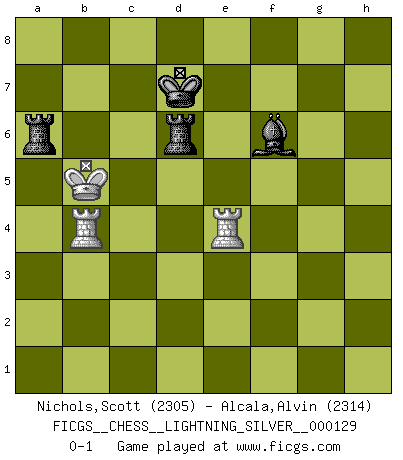 Last move : 0-1 2011 August 9 18:13:15 [Event "FICGS__CHESS__LIGHTNING_SILVER__000129"] [Site "FICGS"] [Date "2011.08.09"] [Round "1"] [White "Nichols,Scott"] [Black "Alcala,Alvin"] [Result "0-1"] [WhiteElo "2305"] [BlackElo "2314"] 1.d4 Nf6 2.c4 c6 3.Nc3 d5 4.Nf3 e6 5.Bg5 h6 6.Bh4 dxc4 7.e4 g5 8.Bg3 b5 9.Ne5 Nbd7 10.Nxc6 Qb6 11.d5 Bb7 12.a4 a6 13.Be2 Bxc6 14.dxc6 Qxc6 15.e5 Nd5 16.Nxd5 exd5 17.Bf3 Rd8 18.Bxd5 Bb4+ 19.Kf1 Qg6 20.axb5 O-O 21.Bxc4 Nxe5 22.Qe2 Nxc4 23.Qxc4 Bc5 24.h4 Qf5 25.hxg5 Rd2 26.f3 axb5 27.Qe4 Qxe4 28.fxe4 hxg5 29.b4 Bd4 30.Rc1 Re8 31.Rh5 f6 32.e5 Kf7 33.exf6 Kxf6 34.Rh3 Rb2 35.Re1 Rc8 36.Re2 Rb1+ 37.Re1 Rxb4 38.Bd6 Rb2 39.Rf3+ Kg7 40.g4 b4 41.Rf5 Kh7 42.Re7+ Kh8 43.Bxb4 Rxb4 44.Rxg5 Bf6 45.Rh5+ Kg8 46.Re2 Rxg4 47.Rf5 Kg7 48.Ref2 Bg5 49.Ke2 Rc3 50.R2f3 Rc2+ 51.Kd3 Rd2+ 52.Kc3 Rd6 53.Kb3 Kg6 54.Rb5 Bf6 55.Rb4 Rg1 56.R3f4 Rgd1 57.Rfc4 Kf5 58.Rb5+ Ke6 59.Re4+ Kd7 60.R5b4 R1d3+ 61.Kc4 Ra3 62.Kb5 R3a6 0-1 Queen's pawn game Kingside Castling by player Black (move 20) 10 pieces endgame at move 43 : White KRRBP , Black KRRBP WHITE : King + 2 Rooks 1 Bishop 1 Pawn BLACK : King + 2 Rooks 1 Bishop 1 Pawn 9 pieces endgame at move 43 : White KRRP , Black KRRBP WHITE : King + 2 Rooks 1 Pawn BLACK : King + 2 Rooks 1 Bishop 1 Pawn 8 pieces endgame at move 44 : White KRRP , Black KRRB WHITE : King + 2 Rooks 1 Pawn BLACK : King + 2 Rooks 1 Bishop 7 pieces endgame at move 46 : White KRR , Black KRRB WHITE : King + 2 Rooks BLACK : King + 2 Rooks 1 Bishop Player Black won this chess game. Follow this game move after move (download)On the chessboard, lies and hypocrisy do not survive long. (Emanuel Lasker) Das Blackmar-Diemer-Gambit verändert den ganzen Menschen! (Emil Joseph Diemer) La batalla por la última verdad nunca sera ganada. Y es por eso que el Ajedrez es tan fascinante. (Hans Kmoch) En blitz, le Cavalier l'emporte sur le Fou. (Vlastimil Hort) Children in the dark cause accidents, accidents in the dark cause children. (Unknown)