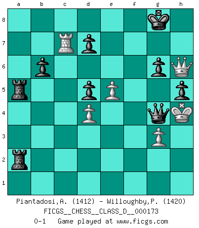 Last move : 0-1 2011 November 21 17:43:47 [Event "FICGS__CHESS__CLASS_D__000173"] [Site "FICGS"] [Date "2011.08.10"] [Round "1"] [White "Piantadosi,Angelo"] [Black "Willoughby,Peter"] [Result "0-1"] [WhiteElo "1412"] [BlackElo "1420"] 1.e4 g6 2.d4 Bg7 3.Nf3 c5 4.dxc5 Qa5+ 5.Bd2 Qxc5 6.Bd3 Bxb2 7.Bc3 Bxc3+ 8.Nxc3 Qxc3+ 9.Nd2 Nc6 10.O-O Nb4 11.Nf3 Nxd3 12.cxd3 e6 13.Rc1 Qb2 14.Rc2 Qg7 15.Qc1 Ne7 16.Rc7 O-O 17.e5 Nd5 18.Rc5 b6 19.Rc4 Ba6 20.Rd4 Rac8 21.Qa3 Bb7 22.Qxa7 Bc6 23.Qa3 Ra8 24.Qb2 Ra5 25.Rc4 Rb5 26.Qd2 f6 27.d4 f5 28.Ne1 Ra5 29.Nd3 f4 30.Nb4 Bb5 31.Nxd5 exd5 32.Rc7 Bxf1 33.Kxf1 Qe7 34.f3 h5 35.g3 fxg3 36.hxg3 Rxf3+ 37.Kg2 Rfa3 38.Qh6 Rxa2+ 39.Kh3 Qe6+ 40.Kh4 Qg4+ 0-1 Robatsch (Modern) defense Kingside Castling by player White (move 10) Kingside Castling by player Black (move 16) Player Black won this chess game. Follow this game move after move (download)I have added these principles to the law: get the Knights into action before both Bishops are developed. (Emanuel Lasker) Schach ist eine Sache der genauen Beurteilung, wann man zuschlagen und wann man sich ducken muss. (Robert James Fischer) El Ajedrez demanda una total concentración. (Bobby Fischer) Comme les marins qui ont mille raisons différentes d'aller en mer, les joueurs d'échecs en ont tout autant avant de s'installer devant une table et jouer... (Vincent Bertignac, philosophe) There are two types of people in this world, good and bad. The good sleep better, but the bad seem to enjoy the waking hours much more. (Woody Allen)