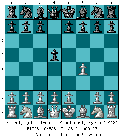 Last move : 0-1 2011 September 21 10:35:25 [Event "FICGS__CHESS__CLASS_D__000173"] [Site "FICGS"] [Date "2011.08.10"] [Round "1"] [White "Robert,Cyril"] [Black "Piantadosi,Angelo"] [Result "0-1"] [WhiteElo "1500"] [BlackElo "1412"] 1.f4 d5 0-1 This chess game has been lost on time (started : 2011.08.10 14:53:1) Bird's Opening Player Black won this chess game. Follow this game move after move (download)Chess holds its master in its own bonds, shackling the mind and brain so that the inner freedom of the very strongest must suffer. (Albert Einstein) Die größte Kunst beim Schach besteht darin dem Gegner nicht zu zeigen was er tun kann. (Garry Kasparov) Preferería tener un Peón que un dedo. (Reuben Fine) Tout change constamment, y compris dans le monde des Echecs. (Botvinnik) The ultimate in disposing one's troops is to be without ascertainable shape. Then the most penetrating spies cannot pry in nor can the wise lay plans against you. (Sun Tzu)