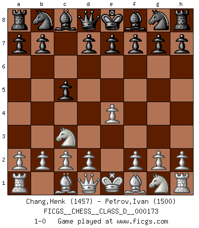 Last move : 1-0 2011 September 20 10:32:18 [Event "FICGS__CHESS__CLASS_D__000173"] [Site "FICGS"] [Date "2011.08.10"] [Round "1"] [White "Chang,Henk"] [Black "Petrov,Ivan"] [Result "1-0"] [WhiteElo "1457"] [BlackElo "1500"] 1.e4 c5 2.Nc3 1-0 This chess game has been lost on time (started : 2011.08.10 14:53:1) Sicilian : Closed Player White won this chess game. Follow this game move after move (download)You must take your opponent into a deep dark forest where 2+2=5, and the path leading out is only wide enough for one. (Mikhail Tal) Das Schach hält seine Meister in eigenen Banden, Fesseln; auf vielerlei Weise formt es ihren Geist, so dass die innere Freiheit selbst des Stärksten beeinflusst wird. (Albert Einstein) La caracteristica mas importante en la posición del Ajedrez es la actividad de las piezas. Esto es absolutamente fundamental en todas las fases del juego: Apertura, Juego Medio y especialmente Finales. La limitación primordial en la actividad de una pieza, es la estructuración de los Peones. (Michael Stean) Pour moi, les échecs ne sont pas un jeu mais un art. (Alexandre Alekhine) I take risks, sometimes patients die, but not taking risks causes more patients to die. So I guess my biggest problem is I've been cursed with the ability to do the math. (Gregory House, House M.D.)