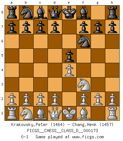Last move : 0-1 2011 September 21 22:38:4 [Event "FICGS__CHESS__CLASS_D__000173"] [Site "FICGS"] [Date "2011.08.10"] [Round "1"] [White "Krakovsky,Peter"] [Black "Chang,Henk"] [Result "0-1"] [WhiteElo "1464"] [BlackElo "1457"] 1.e4 e5 2.Nf3 Nf6 0-1 This chess game has been lost on time (started : 2011.08.10 14:53:1) Petrov's defense Player Black won this chess game. Follow this game move after move (download)Bobby Fischer is the greatest Chess genius of all time ! (Alexander Kotov) Es ist besser die Steine des Gegners zu opfern. (Savielly Grigorievitsch Tartakower) Debes de llevar a tu oponente hacia un profundo y obscuro bosque donde 2+2=5, y el camino que conduce a la salida es suficientemente ancho para solamente uno. (Mikhail Tal) Ce qui caractérise les parties de combat, c'est que si le défenseur a constamment de difficiles problèmes à résoudre, l'attaquant doit chercher sans relâche de nouvelles possibilités d'attaque. (Koblentz) The project of the man are lower than those of the sky. (Chinese proverb)