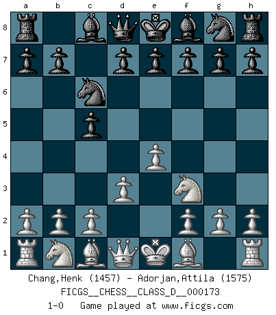 Last move : 1-0 2011 September 22 22:43:22 [Event "FICGS__CHESS__CLASS_D__000173"] [Site "FICGS"] [Date "2011.08.10"] [Round "1"] [White "Chang,Henk"] [Black "Adorjan,Attila"] [Result "1-0"] [WhiteElo "1457"] [BlackElo "1575"] 1.e4 c5 2.d3 Nc6 3.Nf3 1-0 This chess game has been lost on time (started : 2011.08.10 14:53:1) Sicilian defense Player White won this chess game. Follow this game move after move (download)Discovered check is the dive bomber of the Chessboard. (Reuben Fine) Ich erzeugte keinen Neid, da mich die Schachspieler als Musiker und die Musiker als Schachspieler betrachteten. (Mark Taimanov) Nunca antes ha habido un jugador de Ajedrez con tal conocimiento a fondo de las complejidades del juego y una inmensa voluntad absolutamente indomable de ganar. Yo pienso que Fischer es el jugador mas grande que jamás haya existido. (Lisa Lane) Les Cavaliers se révèlent fort utiles dans les positions fermées. D'habitude, les Fous sont un peu plus forts que les Cavaliers dans les positions ouvertes. Qu'on le veuille ou non, il restera toujours des exceptions ! The worth of a book is to be measured by what you can carry away from it. (James Bryce)