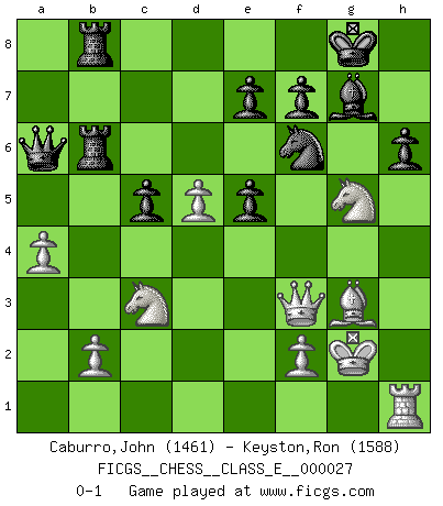 Last move : 0-1 2007 January 18 13:36:3 [Event "FICGS__CHESS__CLASS_E__000027"] [Site "FICGS"] [Date "2006.12.31"] [Round "1"] [White "Caburro,John"] [Black "Keyston,Ron"] [Result "0-1"] [WhiteElo "1461"] [BlackElo "1588"] 1.d4 Nf6 2.c4 c5 3.d5 b5 4.cxb5 a6 5.bxa6 g6 6.Nc3 Bxa6 7.e4 Bxf1 8.Kxf1 d6 9.Nf3 Bg7 10.g3 O-O 11.Kg2 Nbd7 12.a4 Ra6 13.Qe2 Qa8 14.h4 Rb8 15.h5 Nxh5 16.Rxh5 gxh5 17.Ng5 Nf6 18.Bf4 h4 19.Rh1 hxg3 20.Bxg3 Rab6 21.Qd3 Qa6 22.Qf3 h6 23.e5 dxe5 0-1 Benko gambit accepted Kingside Castling by player Black (move 10) Player Black won this chess game. Follow this game move after move (download)In order to improve your game, you must study the endgame before everything else, for whereas the endings can be studied and mastered by themselves, the middle game and the opening must be studied in relation to the endgame. (Jose Raul Capablanca) Über Frauen: Chess is better. (Robert James Fischer) Bobby Fischer es el mas grande genio de Ajedrez de todos los tiempos. (Alexander Kotov) Il n'y a plus de joueurs du niveau de Jacob Murray dont la seule quête est le beau jeu, le plaisir de voir les pièces construire quelque chose. Sur 10 idées à la minute, 9 seront sans intérêt, la dernière s'avèrera géniale. (Christian Bauer) I'll be back. (Arnold Schwarzenegger)
