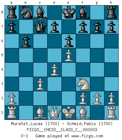 Last move : 0-1 2006 July 7 1:2:35 [Event "FICGS__CHESS__CLASS_C__000003"] [Site "FICGS"] [Date "2006.05.06"] [Round "1"] [White "Muratet,Lucas"] [Black "Schmid,Pablo"] [Result "0-1"] [WhiteElo "1700"] [BlackElo "1700"] 1.e4 c5 2.Nf3 e6 3.c3 Nf6 4.e5 Nd5 5.d4 cxd4 6.cxd4 b6 7.Nc3 Nxc3 8.bxc3 Qc7 0-1 This chess game has been lost on time (started : 2006.05.06 12:23:53) Sicilian defense Player Black won this chess game. Follow this game move after move (download)Alekhine is a poet who creates a work of art out of something that would hardly inspire another man to send home a picture post card. (Max Euwe) Um dein Spiel zu verbessern musst du zuallererst das Endspiel studieren, denn diese kann unabhängig studiert werden. Die Eröffnung und das Mittelspiel müssen immer in Bezug gesetzt werden zum Endspiel. (José Raúl Capablanca) No todos los artistas son jugadores de Ajedrez, pero todos los jugadores de Ajedrez son artistas. (Marcel Duchamp) La tactique est l'élément le plus important du milieu de jeu. (Siegbert Tarrasch) Faith : not wanting to know what is true. (Friedrich Nietzsche)