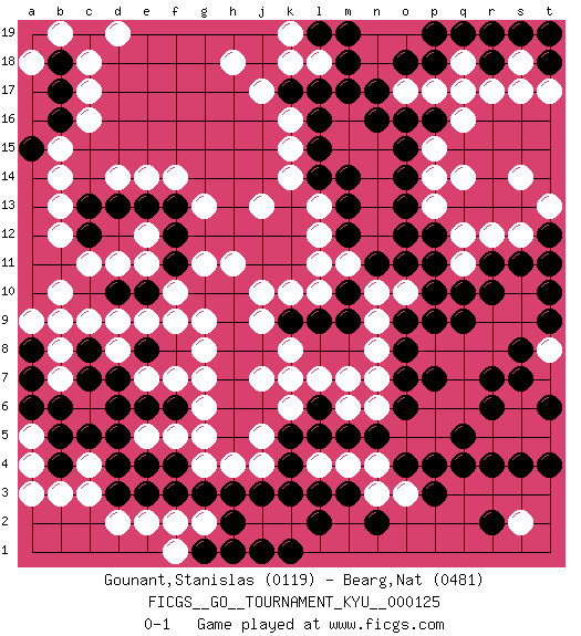 Last move : 0-1 2011 September 26 21:45:46 [Event "FICGS__GO__TOURNAMENT_KYU__000125"] [Site "FICGS"] [Date "2011.08.10"] [Round "1"] [Black "Gounant,Stanislas"] [White "Bearg,Nat"] [Result "0-1"] [Rating 1 "0119"] [Rating 2 "0481"] 1.d3 q17 2.r4 c16 3.d10 r9 4.k4 j17 5.q10 k10 6.s11 k3 7.m3 j2 8.l3 c9 9.j3 k2 10.h3 l4 11.h2 j4 12.k5 j5 13.l5 m4 14.l2 k6 15.m5 n4 16.k1 n6 17.l6 l7 18.n5 o5 19.j1 m6 20.k3 h4 21.o4 n3 22.p4 o3 23.p3 p5 24.n2 r5 25.q5 q6 26.q4 s5 27.s4 t5 28.t4 s2 29.r2 c3 30.c5 c4 31.d4 d2 32.b4 b3 33.d5 a4 34.b5 a5 35.a6 a3 36.b6 e2 37.e3 f2 38.f3 g2 39.g3 g4 40.j6 k7 41.h6 f5 42.f6 g6 43.h7 g7 44.h8 g8 45.h9 g9 46.h10 h11 47.g10 f9 48.e6 f10 49.h5 g5 50.o6 p6 51.o7 n7 52.o8 n8 53.o9 n9 54.p10 n10 55.o12 g11 56.t10 s9 57.t9 t8 58.q9 q8 59.n11 m11 60.m13 l13 61.m12 l12 62.l15 k14 63.l14 j13 64.o16 o17 65.m17 p15 66.p16 q16 67.n16 p17 68.o15 p14 69.o14 p13 70.o13 r12 71.r11 s12 72.o11 o10 73.p9 p8 74.p11 j10 75.p7 q7 76.r6 s6 77.r7 r8 78.s7 s10 79.t11 q12 80.t6 q11 81.r10 k16 82.l16 k15 83.k17 k18 84.l17 l18 85.m18 f14 86.l19 k19 87.m19 h18 88.o18 s17 89.p18 q18 90.n17 s14 91.q19 r19 92.p19 d11 93.r18 s18 94.s19 r17 95.r19 d9 96.p12 q14 97.t12 t13 98.t18 t17 99.t19 e5 100.d7 e7 101.e8 f7 102.d6 d8 103.c8 b8 104.c7 b10 105.b17 c17 106.b16 b15 107.b18 c18 108.a15 b14 109.c19 d19 110.f11 e11 111.f12 e12 112.f13 g13 113.e13 e14 114.d13 d14 115.c13 b13 116.c12 c11 117.e10 b12 118.m10 l11 119.m9 m7 120.k9 j9 121.j8 k8 122.l9 l10 123.f4 e9 124.e4 b7 125.a8 a9 126.a7 b9 127.m14 b19 128.s8 j7 129.g1 f1 130.h1 a18 0-1 Here are the names of the openings (joseki) played in the four corners : Corner q4 : r4 r9 Komoku (Somok, Xiao~mu`) 3-4 Point. The komoku (3-4) point is the traditional corner enclosure move.. Corner q16 : q17 s11 Komoku (Somok, Xiao~mu`) 3-4 Point. The komoku (3-4) point is the traditional corner enclosure move.. Corner d4 : d3 j2 Komoku (Somok, Xiao~mu`) 3-4 Point. The komoku (3-4) point is the traditional corner enclosure move.. Player White won this Go (weiqi, baduk) game. Follow this game move after move (download)Against three in a row, play right in the center. (Anonymous) A good book on your shelf is a friend that turns its back on you and remains a friend. (Author unknown)
