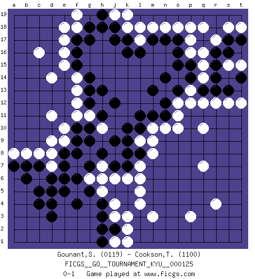 Last move : 0-1 2011 December 1 13:28:19 [Event "FICGS__GO__TOURNAMENT_KYU__000125"] [Site "FICGS"] [Date "2011.08.10"] [Round "1"] [Black "Gounant,Stanislas"] [White "Cookson,Timothy"] [Result "0-1"] [Rating 1 "0119"] [Rating 2 "1100"] 1.d3 c16 2.q17 r4 3.k4 d5 4.c5 q10 5.k16 c6 6.c4 g6 7.e5 e6 8.d4 f5 9.d6 d7 10.d5 k6 11.c7 c8 12.b6 m3 13.e7 d8 14.f6 f7 15.e6 d11 16.g7 h7 17.f8 j4 18.g5 h6 19.f4 q15 20.j5 h5 21.h4 j3 22.k5 k3 23.o15 p13 24.s16 l6 25.m13 e17 26.h13 r12 27.h18 d14 28.k10 p16 29.p15 q16 30.h3 r17 31.r16 q18 32.s17 p17 33.o13 o12 34.n12 n10 35.n11 o11 36.p14 s18 37.r15 q14 38.r14 l5 39.q13 p12 40.r13 s12 41.s13 q7 42.t17 t15 43.t14 s15 44.o16 o18 45.o17 n18 46.m17 m10 47.l11 b8 48.h8 e10 49.f15 e15 50.f16 e16 51.g9 f14 52.g14 f13 53.g13 f12 54.j9 m8 55.j7 j6 56.k7 l7 57.k8 q12 58.n14 p3 59.l8 l9 60.k9 m18 61.n17 l17 62.l16 l18 63.k17 k18 64.j18 j19 65.h19 k19 66.j17 f18 67.g17 f19 68.f17 t18 69.l10 m9 70.g12 g11 71.h11 h10 72.g10 f11 73.f10 e9 74.f9 t12 75.j2 k2 76.h2 j1 77.h1 k1 78.b7 a8 79.a7 o10 80.j12 l4 81.e8 d9 82.m11 p18 83.g18 e18 0-1 Here are the names of the openings (joseki) played in the four corners : Corner d4 : d3 d5 Komoku (Somok, Xiao~mu`) 3-4 Point. The komoku (3-4) point is the traditional corner enclosure move.. Ikken Takagakari (Hankan Nop'dakeolch'im, Yi Gaogua`jiao~, 1-Space High Approach). The 5-4 approach move has become more popular in modern times, as modern Go emphasizes speed and influence. Corner q16 : q17 q15 Komoku (Somok, Xiao~mu`) 3-4 Point. The komoku (3-4) point is the traditional corner enclosure move.. Ikken Takagakari (Hankan Nop'dakeolch'im, Yi Gaogua`jiao~, 1-Space High Approach). The 5-4 approach move has become more popular in modern times, as modern Go emphasizes speed and influence. Player White won this Go (weiqi, baduk) game. Follow this game move after move (download)It is difficult to know exactly what you are doing. (Pierre Audouard) The beginning of wisdom is silence. The second step is listening. (Unknown)