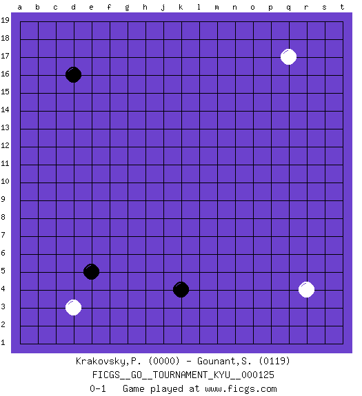 Last move : 0-1 2011 August 12 8:23:33 [Event "FICGS__GO__TOURNAMENT_KYU__000125"] [Site "FICGS"] [Date "2011.08.10"] [Round "1"] [Black "Krakovsky,Peter"] [White "Gounant,Stanislas"] [Result "0-1"] [Rating 1 "0000"] [Rating 2 "0119"] 1.d16 r4 2.k4 d3 3.e5 q17 0-1 Here are the names of the openings (joseki) played in the four corners : Corner d4 : d3 e5 Komoku (Somok, Xiao~mu`) 3-4 Point. The komoku (3-4) point is the traditional corner enclosure move.. Corner q4 : r4 0-1 Komoku (Somok, Xiao~mu`) 3-4 Point. The komoku (3-4) point is the traditional corner enclosure move.. Player White won this Go (weiqi, baduk) game. Follow this game move after move (download)The poor player plays the opponent's game for him. (Anonymous) If you know the enemy and know yourself you need not fear the results of a hundred battles. (Sun Tzu)