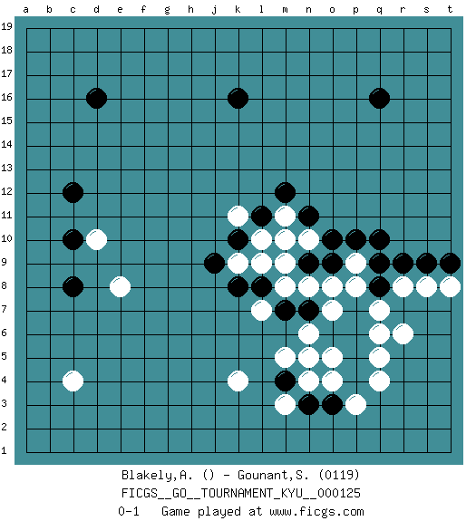 Last move : 0-1 2011 September 28 3:53:32 [Event "FICGS__GO__TOURNAMENT_KYU__000125"] [Site "FICGS"] [Date "2011.08.10"] [Round "1"] [Black "Blakely,Anthony"] [White "Gounant,Stanislas"] [Result "0-1"] [Rating 2 "0119"] 1.q16 c4 2.d16 q4 3.q10 d10 4.k16 k4 5.k10 r8 6.r9 s8 7.s9 t8 8.t9 q7 9.q8 r6 10.p7 p8 11.q9 o7 12.p6 o8 13.o6 n6 14.n5 o5 15.p5 o4 16.p4 p3 17.o3 n4 18.m4 m5 19.n3 n5 20.n7 n8 21.m7 q5 22.c12 q6 23.c8 e8 24.c10 m3 25.n9 m8 26.l8 l7 27.o9 l9 28.k8 m9 29.m10 k9 30.j9 l10 31.l11 p9 32.p10 n10 33.o10 m11 34.n11 m10 35.m12 k11 0-1 Here are the names of the openings (joseki) played in the four corners : Corner d4 : c4 c8 Komoku (Somok, Xiao~mu`) 3-4 Point. The komoku (3-4) point is the traditional corner enclosure move.. Player White won this Go (weiqi, baduk) game. Follow this game move after move (download)Keep inessential ataris till the end. (Anonymous) Always remember that you are unique; just like everyone else. (Unknown)