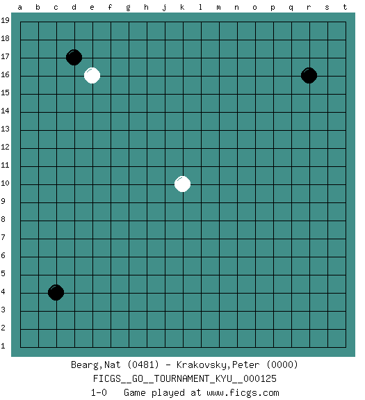 Last move : 1-0 2011 September 15 10:20:23 [Event "FICGS__GO__TOURNAMENT_KYU__000125"] [Site "FICGS"] [Date "2011.08.10"] [Round "1"] [Black "Bearg,Nat"] [White "Krakovsky,Peter"] [Result "1-0"] [Rating 1 "0481"] [Rating 2 "0000"] 1.c4 k10 2.d17 e16 3.r16 1-0 This go game has been lost on time (started : 2011.08.10 16:39:6) Here are the names of the openings (joseki) played in the four corners : Corner d16 : d17 e16 Komoku (Somok, Xiao~mu`) 3-4 Point. The komoku (3-4) point is the traditional corner enclosure move.. Player Black won this Go (weiqi, baduk) game. Follow this game move after move (download)Grab the border points between two moyos. (Anonymous) War is the child of passion, passion is the child of narcissism and narcissism is the child. (...) Another game ? (Thibault de Vassal)