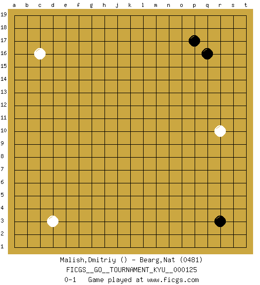 Last move : 0-1 2011 September 14 22:21:2 [Event "FICGS__GO__TOURNAMENT_KYU__000125"] [Site "FICGS"] [Date "2011.08.10"] [Round "1"] [Black "Malish,Dmitriy"] [White "Bearg,Nat"] [Result "0-1"] [Rating 2 "0481"] 1.q16 d3 2.r3 c16 3.p17 r10 0-1 This go game has been lost on time (started : 2011.08.10 16:39:6) Here are the names of the openings (joseki) played in the four corners : Player White won this Go (weiqi, baduk) game. Follow this game move after move (download)More haste less speed. (John Fairbairn) Internet: Absolute communication, absolute isolation. (Paul Carvel)