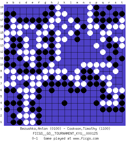Last move : 0-1 2012 February 18 8:26:46 [Event "FICGS__GO__TOURNAMENT_KYU__000125"] [Site "FICGS"] [Date "2011.08.10"] [Round "1"] [Black "Bezushko,Anton"] [White "Cookson,Timothy"] [Result "0-1"] [Rating 1 "0100"] [Rating 2 "1100"] 1.q16 d16 2.q3 d4 3.f3 c6 4.k4 r6 5.q5 s4 6.q6 r7 7.q7 r8 8.f5 f7 9.f17 f15 10.j16 o17 11.m17 q17 12.r17 p16 13.q18 q15 14.p17 r16 15.q17 o15 16.r14 r15 17.r11 q8 18.p8 p9 19.o9 o8 20.p7 p10 21.n8 o10 22.o7 s14 23.r13 p13 24.s13 o18 25.s18 s16 26.s17 t17 27.n16 o16 28.c14 c12 29.c9 e12 30.e9 g9 31.d7 e6 32.f9 g8 33.f11 e11 34.g10 h10 35.h11 j11 36.h12 j12 37.h13 d14 38.c17 c16 39.d17 e16 40.e17 b17 41.b18 j13 42.h14 j14 43.h15 g16 44.h18 l8 45.l6 m9 46.h6 b15 47.s10 s9 48.s12 q12 49.c3 d3 50.b4 b5 51.b2 e2 52.a3 c2 53.c1 d2 54.c4 d6 55.f2 j8 56.m14 l15 57.m15 l17 58.l16 k16 59.k15 m16 60.t18 j15 61.l16 k14 62.k17 m16 63.t11 j17 64.f12 k18 65.r19 t13 66.d10 e10 67.f10 c8 68.b10 d8 69.d9 b8 70.c11 h17 71.g17 h16 72.b12 d13 73.c13 d12 74.n9 n10 75.r5 s5 76.s3 r4 77.r3 q4 78.p4 a5 79.a4 f13 80.a17 b16 81.c5 d5 82.b6 b7 83.a6 a7 84.f1 e1 85.t4 t6 86.k7 m7 87.m6 n7 88.n6 m8 89.o8 a13 90.b13 b9 91.a11 c15 92.k8 k9 93.e4 a9 94.a10 t16 95.j7 j19 96.h19 a14 97.a12 j9 98.p19 o19 99.b14 a15 100.g14 f14 101.h8 h9 102.h7 g13 103.g12 j18 104.g18 q14 105.f6 e7 106.t3 g15 107.g7 f8 108.p18 e8 109.t5 s6 110.f16 t14 111.l7 d11 112.e3 e5 113.a18 q10 114.a16 d1 115.b1 r10 0-1 Here are the names of the openings (joseki) played in the four corners : Corner d4 : d4 f3 Hoshi (Hwajeom, Seongjeom, Xingwei`) 4-4 Point. The star or hoshi (4-4) point, emphasizing influence at the potential expense of territory. Ikken Kakari (Hankan Keolch'im, Yi Gua`jiao~, 1-Space Low Approach). Black 2 is the standard approach move to the 4-4. Corner q4 : q3 r6 Komoku (Somok, Xiao~mu`) 3-4 Point. The komoku (3-4) point is the traditional corner enclosure move.. Niken Kakari (Dukan Keolch'im, E`r Gua`jiao~, 2-Space Low Approach). White 2 is used with friendly forces backing it up. Its purpose is to prevent a pincer. Locally it results in a loss, but may be appropriate fuseki strategy. It was popular in the late 1950s and early 1960s, but is not seen often nowadays, having been replaced by the one-space high approach, with which it has points in common. Corner d16 : d16 f17 Hoshi (Hwajeom, Seongjeom, Xingwei`) 4-4 Point. The star or hoshi (4-4) point, emphasizing influence at the potential expense of territory. Ikken Kakari (Hankan Keolch'im, Yi Gua`jiao~, 1-Space Low Approach). Black 2 is the standard approach move to the 4-4. Corner q16 : q16 o17 Hoshi (Hwajeom, Seongjeom, Xingwei`) 4-4 Point. The star or hoshi (4-4) point, emphasizing influence at the potential expense of territory. Ikken Kakari (Hankan Keolch'im, Yi Gua`jiao~, 1-Space Low Approach). White 2 is the standard approach move to the 4-4. Player White won this Go (weiqi, baduk) game. Follow this game move after move (download)... {it is} something unearthly... if there are sentient beings on other planets, then they play go. (Emanuel Lasker, chess world champion) Remember : Your focus determines your reality. (Qui-Gon Jinn in Star Wars ep.1)