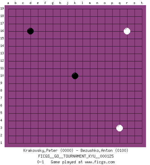 Last move : 0-1 2011 August 12 8:23:39 [Event "FICGS__GO__TOURNAMENT_KYU__000125"] [Site "FICGS"] [Date "2011.08.10"] [Round "1"] [Black "Krakovsky,Peter"] [White "Bezushko,Anton"] [Result "0-1"] [Rating 1 "0000"] [Rating 2 "0100"] 1.d16 q3 2.k10 r16 0-1 Here are the names of the openings (joseki) played in the four corners : Corner q4 : q3 0-1 Komoku (Somok, Xiao~mu`) 3-4 Point. The komoku (3-4) point is the traditional corner enclosure move.. Player White won this Go (weiqi, baduk) game. Follow this game move after move (download)Keep inessential ataris till the end. (Anonymous) Excelling at chess has long been considered a symbol of more general intelligence. That is an incorrect assumption in my view, as pleasant as it might be. But for the purposes of argument and investigation, chess is, in Russkin-Gutman's words, 'an unparalleled laboratory, since both the learning process and the degree of ability obtained can be objectified and quantified, providing an excellent comparative framework on which to use rigorous analytical techniques.' (The Chess Master and the Computer, by Garry Kasparov - 2010)