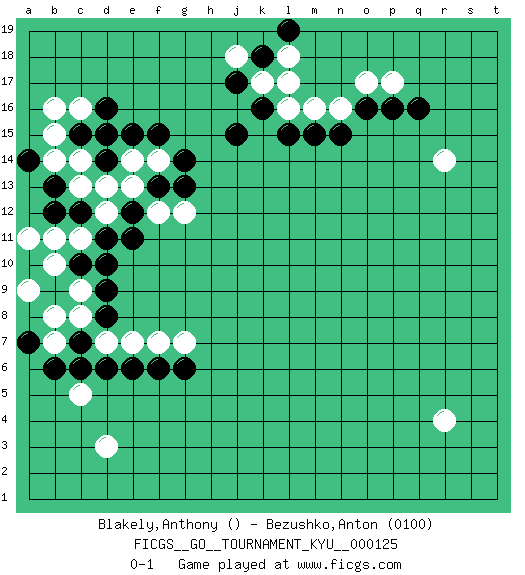 Last move : 0-1 2011 September 30 2:51:46 [Event "FICGS__GO__TOURNAMENT_KYU__000125"] [Site "FICGS"] [Date "2011.08.10"] [Round "1"] [Black "Blakely,Anthony"] [White "Bezushko,Anton"] [Result "0-1"] [Rating 2 "0100"] 1.q16 d3 2.d16 r4 3.d10 r14 4.k16 o17 5.o16 p17 6.p16 n16 7.n15 m16 8.m15 l16 9.l15 k17 10.j17 l17 11.j15 c8 12.c7 c5 13.d8 c9 14.d9 d7 15.d6 e7 16.c6 b11 17.c10 b10 18.c12 b7 19.b6 b8 20.a7 a9 21.b12 a11 22.e6 f7 23.f6 g7 24.g6 c11 25.d11 d12 26.e12 d13 27.d14 e13 28.e11 g12 29.f13 e14 30.e15 f14 31.g14 f12 32.g13 c14 33.f15 c13 34.b13 b14 35.a14 b15 36.c15 c16 37.d15 b16 38.k18 l18 39.l19 j18 0-1 Here are the names of the openings (joseki) played in the four corners : Corner q16 : q16 r14 Hoshi (Hwajeom, Seongjeom, Xingwei`) 4-4 Point. The star or hoshi (4-4) point, emphasizing influence at the potential expense of territory. Ikken Kakari (Hankan Keolch'im, Yi Gua`jiao~, 1-Space Low Approach). White 2 is the standard approach move to the 4-4. Player White won this Go (weiqi, baduk) game. Follow this game move after move (download)Fighting must not be the key to go, it should be reserved as your last resource. (Zhong-Pu Liu, about Weiqi) Whoever said the pen is mightier than the sword obviously never encountered automatic weapons. (US General Douglas MacArthur)