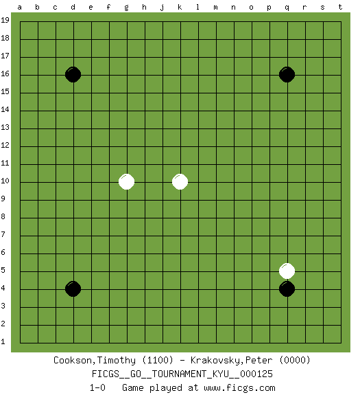 Last move : 1-0 2011 August 12 8:23:44 [Event "FICGS__GO__TOURNAMENT_KYU__000125"] [Site "FICGS"] [Date "2011.08.10"] [Round "1"] [Black "Cookson,Timothy"] [White "Krakovsky,Peter"] [Result "1-0"] [Rating 1 "1100"] [Rating 2 "0000"] 1.d4 k10 2.d16 g10 3.q4 q5 4.q16 1-0 Here are the names of the openings (joseki) played in the four corners : Corner q4 : q4 q5 Hoshi (Hwajeom, Seongjeom, Xingwei`) 4-4 Point. The star or hoshi (4-4) point, emphasizing influence at the potential expense of territory. Player Black won this Go (weiqi, baduk) game. Follow this game move after move (download)Connect with good shape. (Anonymous) When you don't know what to do, walk fast and look worried. (Anonymous)