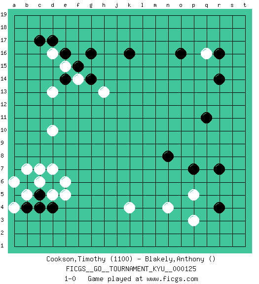Last move : 1-0 2011 October 12 18:20:6 [Event "FICGS__GO__TOURNAMENT_KYU__000125 "] [Site "FICGS"] [Date "2011.08.10"] [Round "1"] [Black "Cookson,Timothy "] [White "Blakely,Anthony "] [Result "1-0"] [Rating 1 "1100"] 1.d4 q16 2.r4 d16 3.r14 c6 4.d6 d5 5.c5 e5 6.c4 d7 7.b6 c7 8.o16 e6 9.q11 d10 10.g16 k4 11.k16 n4 12.c17 a6 13.d17 b5 14.b4 b7 15.r16 a4 16.r7 p3 17.p7 p5 18.n8 d13 19.e16 e15 20.f15 f14 21.g14 h13 22.e14 1-0 Here are the names of the openings (joseki) played in the four corners : Corner q16 : q16 r14Hoshi (Hwajeom, Seongjeom, Xingwei`) 4-4 Point. The star or hoshi (4-4) point, emphasizing influence at the potential expense of territory.Ikken Kakari (Hankan Keolch'im, Yi Gua`jiao~, 1-Space Low Approach). Black 2 is the standard approach move to the 4-4. Corner d4 : d4 c6Hoshi (Hwajeom, Seongjeom, Xingwei`) 4-4 Point. The star or hoshi (4-4) point, emphasizing influence at the potential expense of territory.Ikken Kakari (Hankan Keolch'im, Yi Gua`jiao~, 1-Space Low Approach). White 2 is the standard approach move to the 4-4. Corner d16 : d16 g16Hoshi (Hwajeom, Seongjeom, Xingwei`) 4-4 Point. The star or hoshi (4-4) point, emphasizing influence at the potential expense of territory.Niken Takagakari (Dukan Nop'dakeolch'im, E`r Gaojia, 2-Space High Approach). Black 2 is a light approach move. Rarely played in even games, Black 2 is typically employed in handicap games. White continues with 6-4 or 3-10. In Korean Sunjang Baduk White has a stone on 8-4. Corner q4 : r4 n4Komoku (Somok, Xiao~mu`) 3-4 Point. The komoku (3-4) point is the traditional corner enclosure move.. Player Black won this Go (weiqi, baduk) game.Follow this game move after move (download ) If you have won four corners, resign. (Anonymous) I couldn't make any sense out of what this particular thread is about. It sounds like R2 D2 computer speaking. A space fight ?!? Some 'command' problems in Moscow ? Some killers & narcotic addicts attacking some game & a god wannabe ?? (Dinesh De Silva, lost in a russian conflict in FICGS forum)