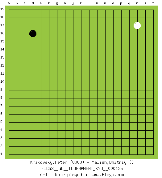 Last move : 0-1 2011 September 17 10:30:19 [Event "FICGS__GO__TOURNAMENT_KYU__000125"] [Site "FICGS"] [Date "2011.08.10"] [Round "1"] [Black "Krakovsky,Peter"] [White "Malish,Dmitriy"] [Result "0-1"] [Rating 1 "0000"] 1.d16 r17 0-1 This go game has been lost on time (started : 2011.08.10 16:39:6) Here are the names of the openings (joseki) played in the four corners : Player White won this Go (weiqi, baduk) game. Follow this game move after move (download)For rectangular six in the corner, dame is necessary. (Anonymous) The only thing that matters is the evidence. (Horatio Caine, C.S.I. Miami)